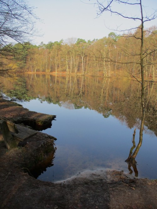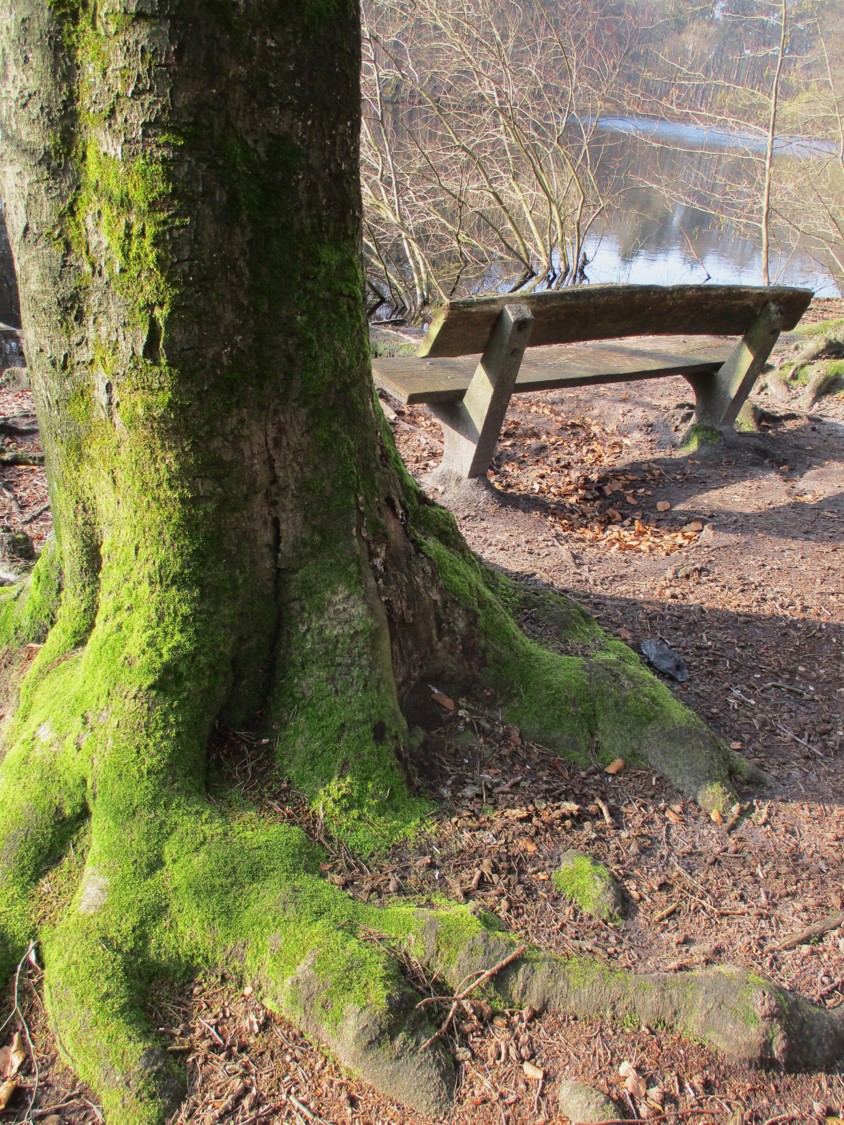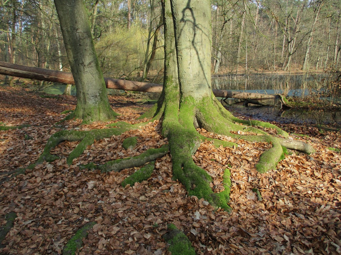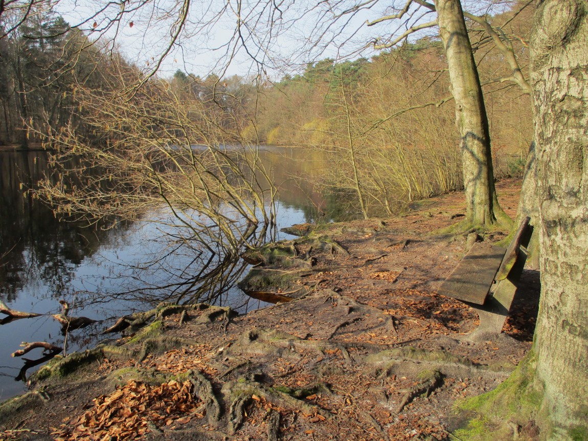 Und nochmal, wieder anders – durch übermäßigen Besuch am Ufer freigelegte Wurzelstrukturen, Blick O –> W über`n Teich.