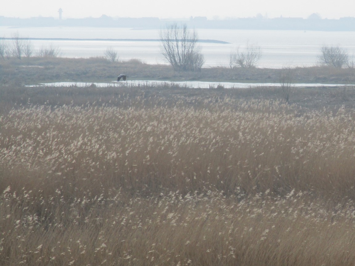 Hetlinger Elbdeich – im Vorland streicht ein Graureiher über alte Reetbestände, sucht ein neues Fischrevier.