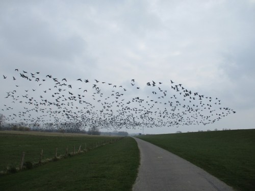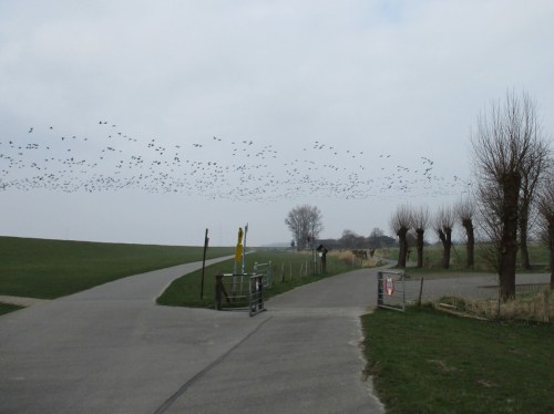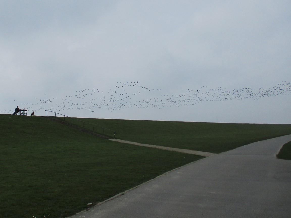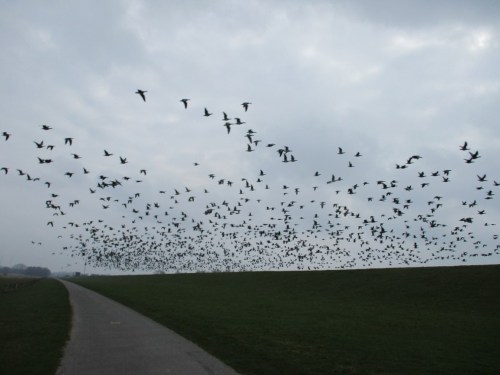 Gerade noch ruhig vorbeigefahren … Da geht hinter mir ein großer Schwarm Nonnengänse hoch. Ich war`s nicht!