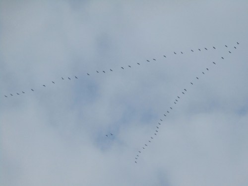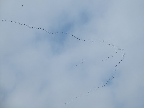 Elbdeich Hetlingen – lautes Trompeten zieht meinen Blick hoch. Ein riesiger Kranichschwarm zieht nordostwärts, bogenförmig.