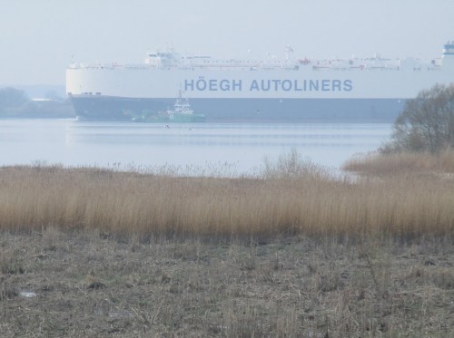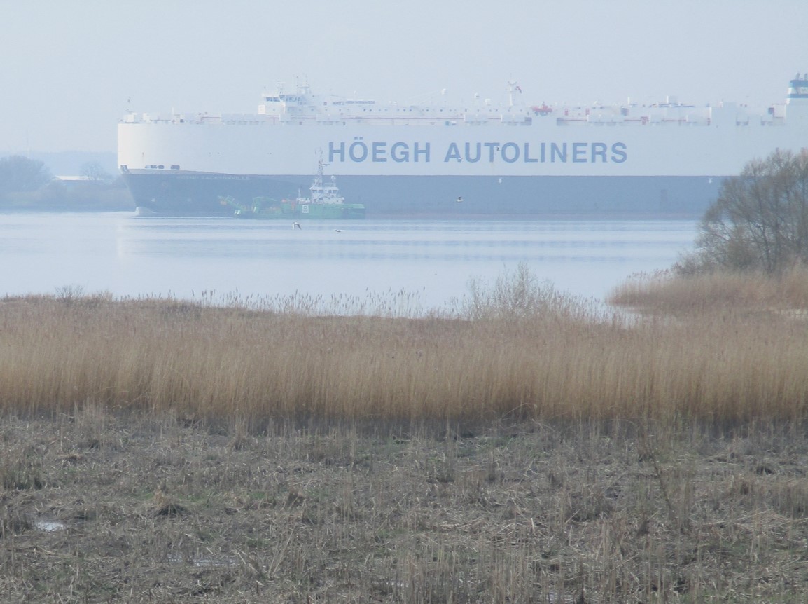 Ein Autofrachter, Hoegh Jacksonville, zieht gen Hamburger Hafen, vorbei an nicht nachgeforschtem Spezialschiff – davor, über der Elbe, Möwen.