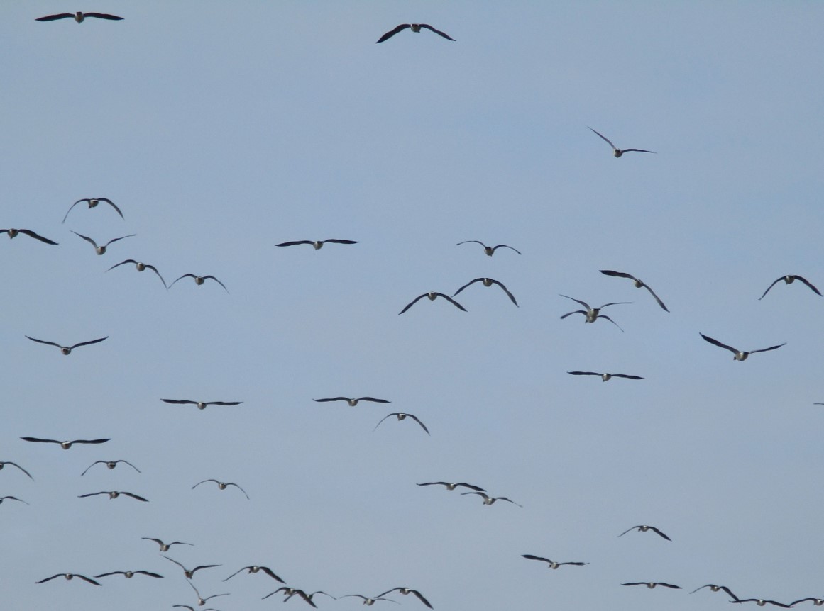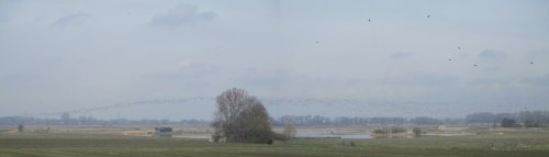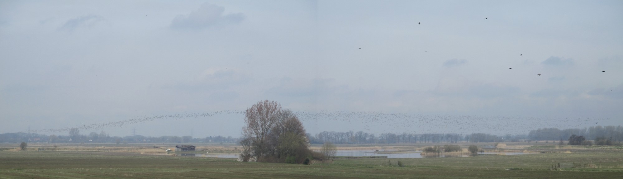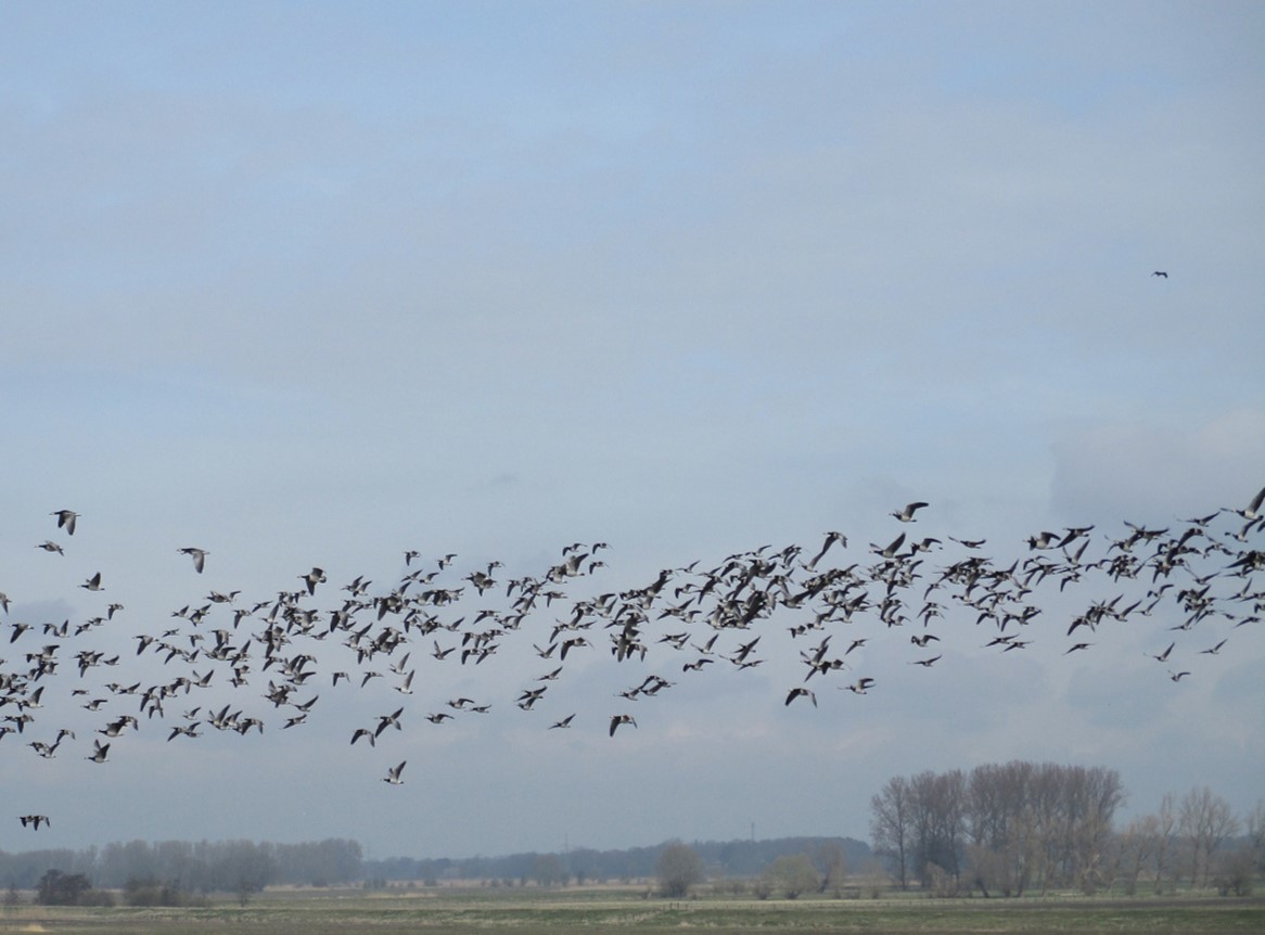 Auf dem Elbdeich Fährmannssand – hinter mir Getöse aus der Ferne, der gesamte Horizont wird von Richtung Elbe fliehenden Nonnengansmassen überspannt.