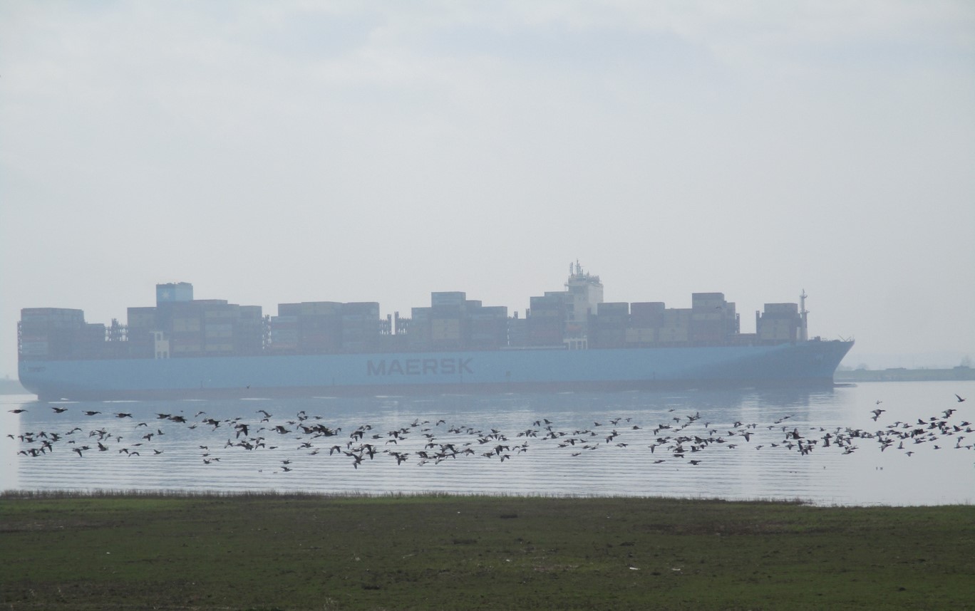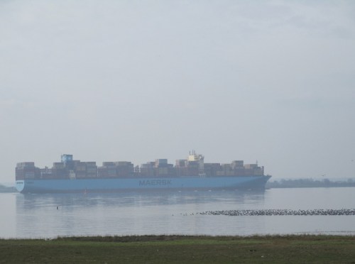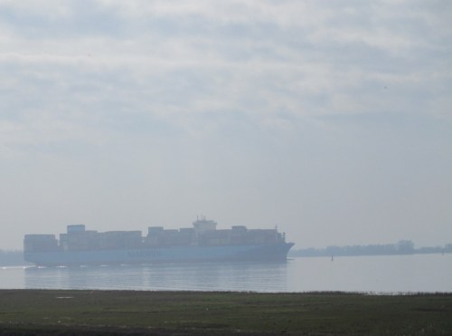 Elbeseits naht ein MAERSK-Großcontainerfrachter, seewärts.