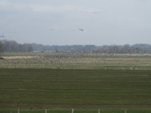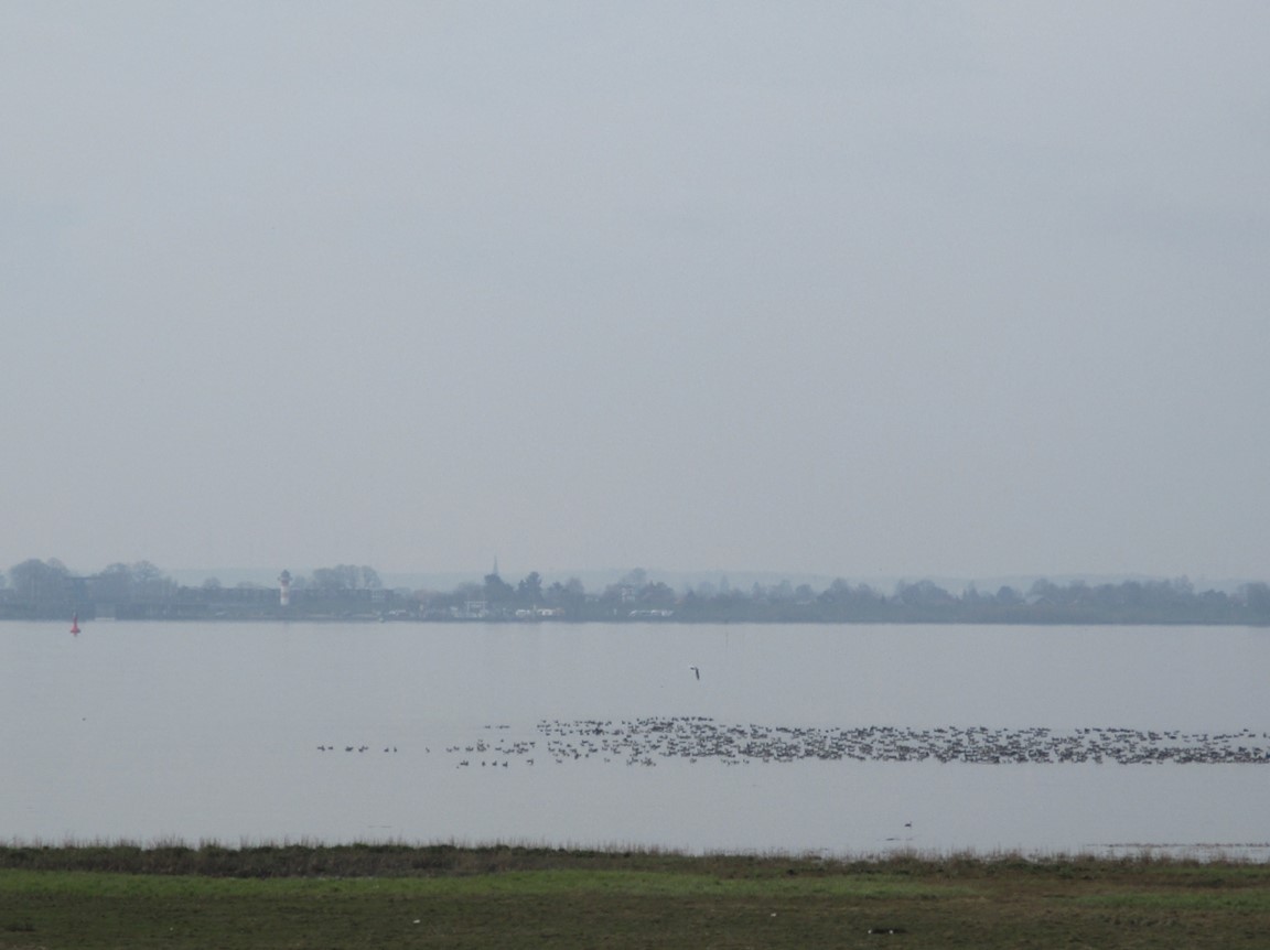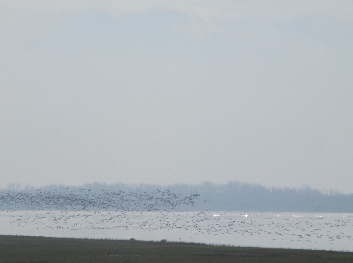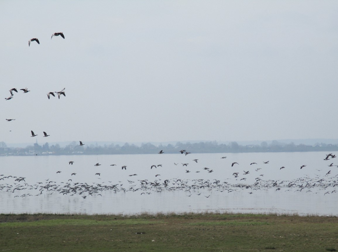 Binnendeichs scheuchen die Nonnengansmassen Tausende bei Fährmannssand äsende Nonnengänse auf.