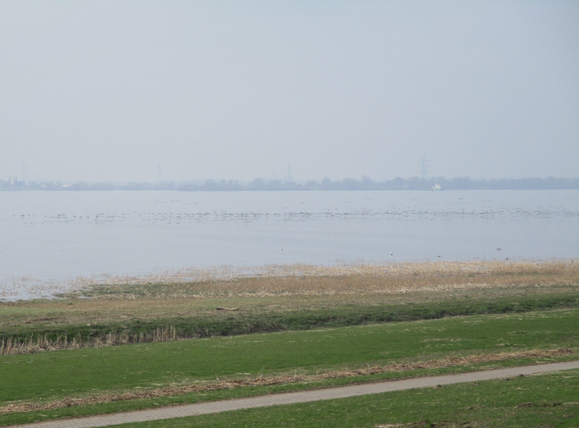 Angesichts ruhigen Wetters bin ich auf Elbdeichrunde entgegen den Uhrzeigersinn, radele bei diesiger Sicht auf den Elbdeich Hetlingen.