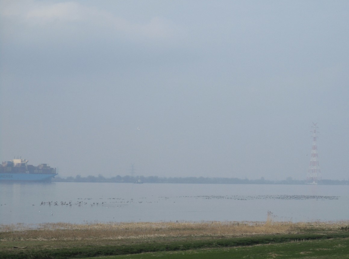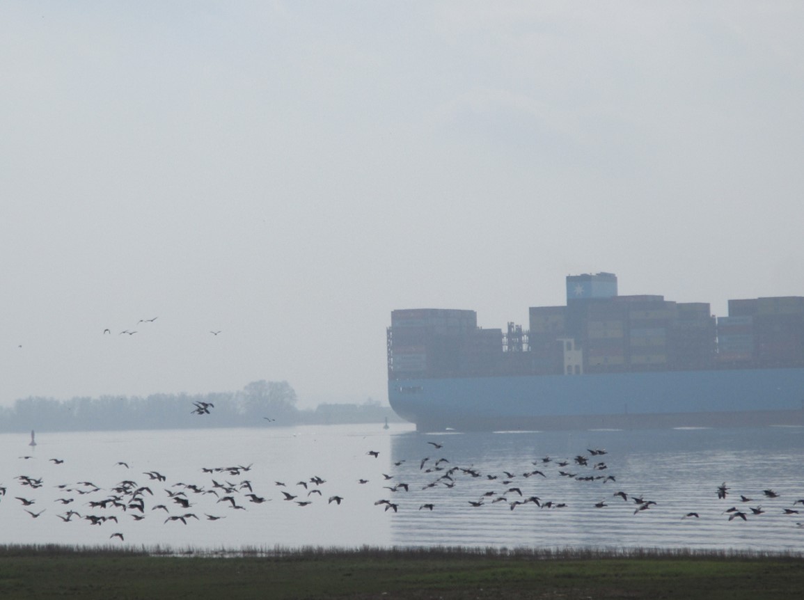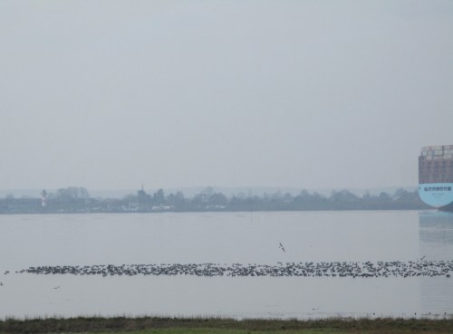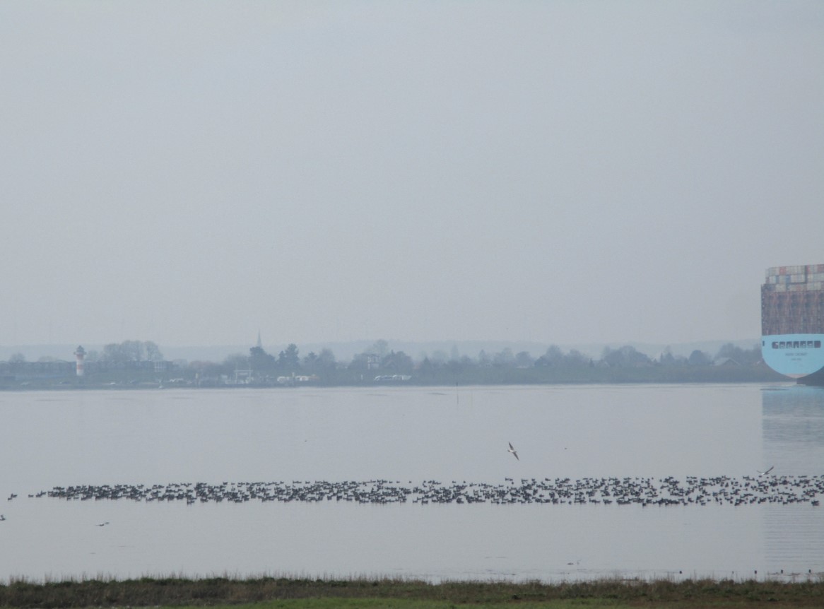Wenig später, Blick Richtung Stade, passiert der Großfrachter auch den Fährmannssandschwarm.