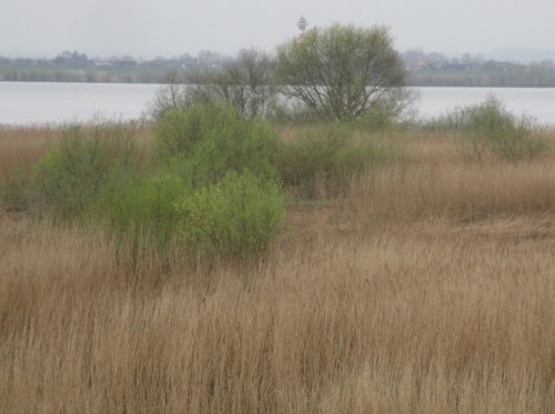 Blick zur Elbe – Auwaldsukzession im Reet hat begonnen. Die jungen Bäume, in dieser Phase meist Weiden, legen frisches Grün an.