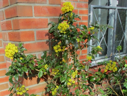 Das Gelb der Mahonie am Eingang ist teils von Hummelköniginnen gefleddert, teils in Entwicklung, viele Knospen warten noch ab – so lange Spreizung erinnere ich bisher nicht.