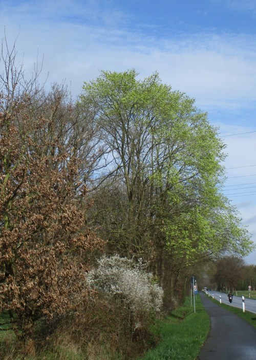Auf der Geest, B 431 – Eichenblätter des Vorjahrs vielfach noch am Baum, braun; weisse Schlehenblüten – hellgrün blühen Ulmen.