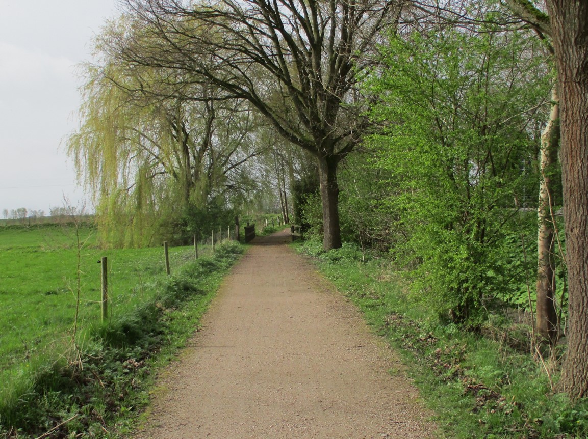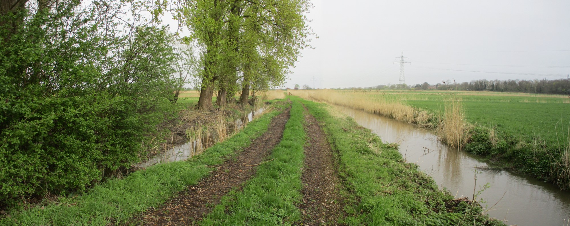 Ausblick vom unteren Geesthang in die Marsch – Schlehe weiss, variierendes Grün. Regenschübe transportieren fortwährend Hangmaterial aus dem Straßenseitenraum, zwischenlagernd auf der Straße, in den zum Marschgraben konvertierenden Moränenbach.
