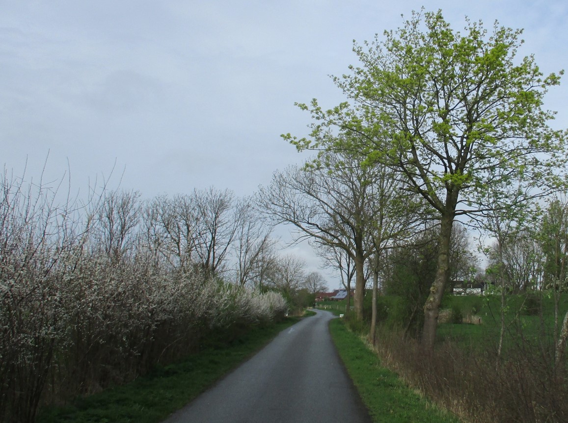 Auf der Geest, B 431 – Eichenblätter des Vorjahrs vielfach noch am Baum, braun; weisse Schlehenblüten – hellgrün blühen Ulmen.
