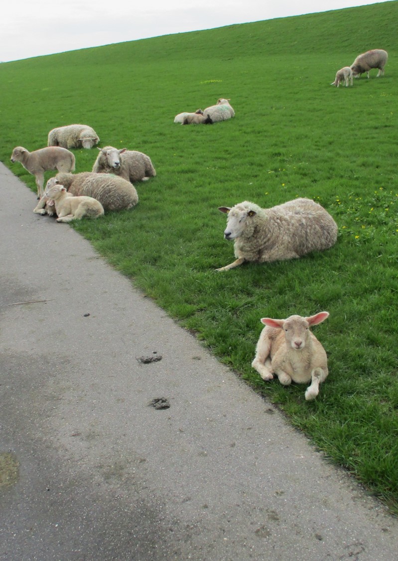 Igitt, der Stall scheint ungepflegt. Als wären sie zum Sauberregnen rausgelassen, finden sich nun Osterlämmer am Deich.