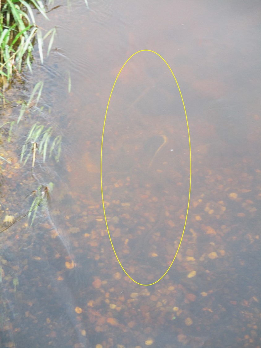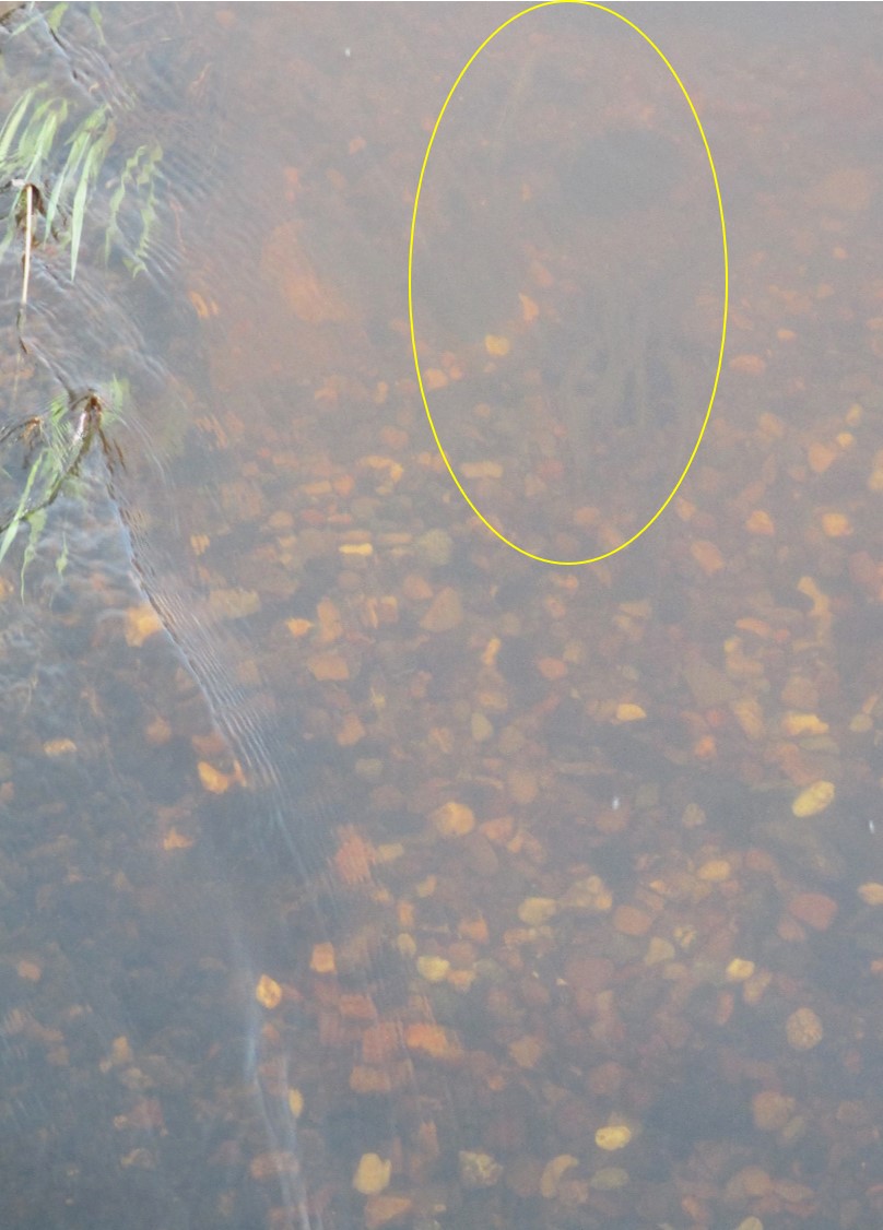 5-10 laichende Flussneunaugen befinden sich in steter Bewegung – so „live“ besser auszumachen als statisch im Foto.