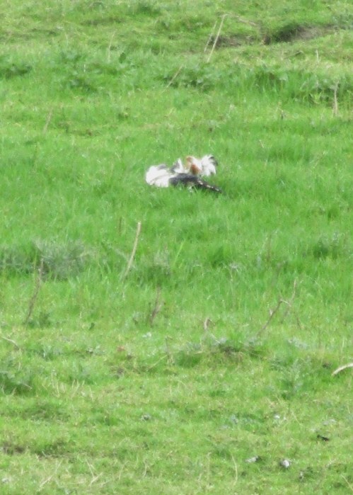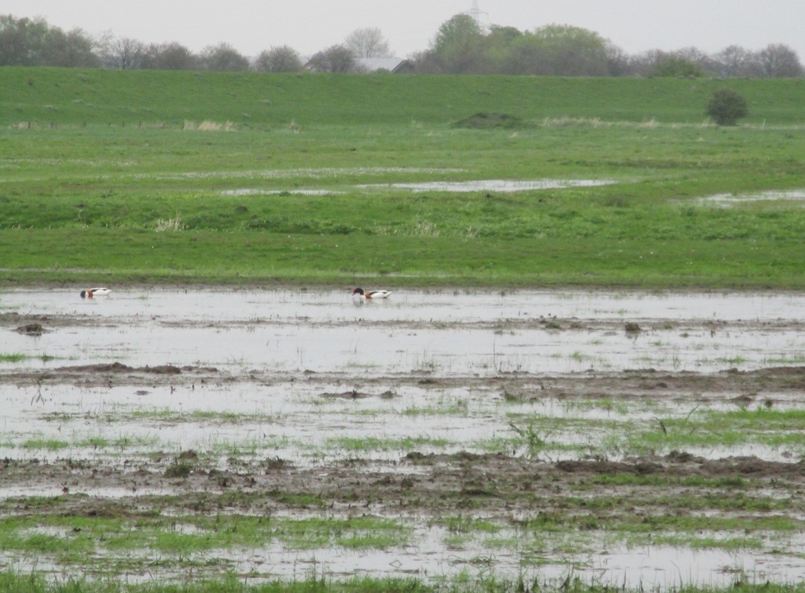 Rostbraun, vorher bereits tragisch erwähnt – ein Brandganspaar nutzt gute Futterstelle, (immer noch Überschwemmungswiese).