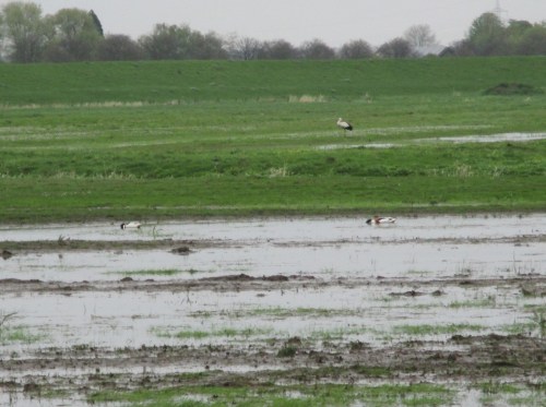 Während die Brandgänse munter weiterfuttern, orientiert sich der Storch und geht dann zielgerichtet, suchend und findend, los.