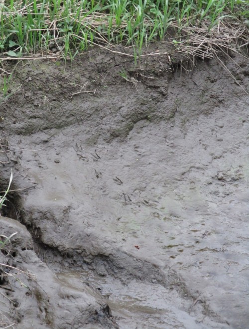 Spuren – wer solch Steilhang hochwill, ist gut beraten, Steigeisen, lange Krallen wie ein Nutria zu besitzen.