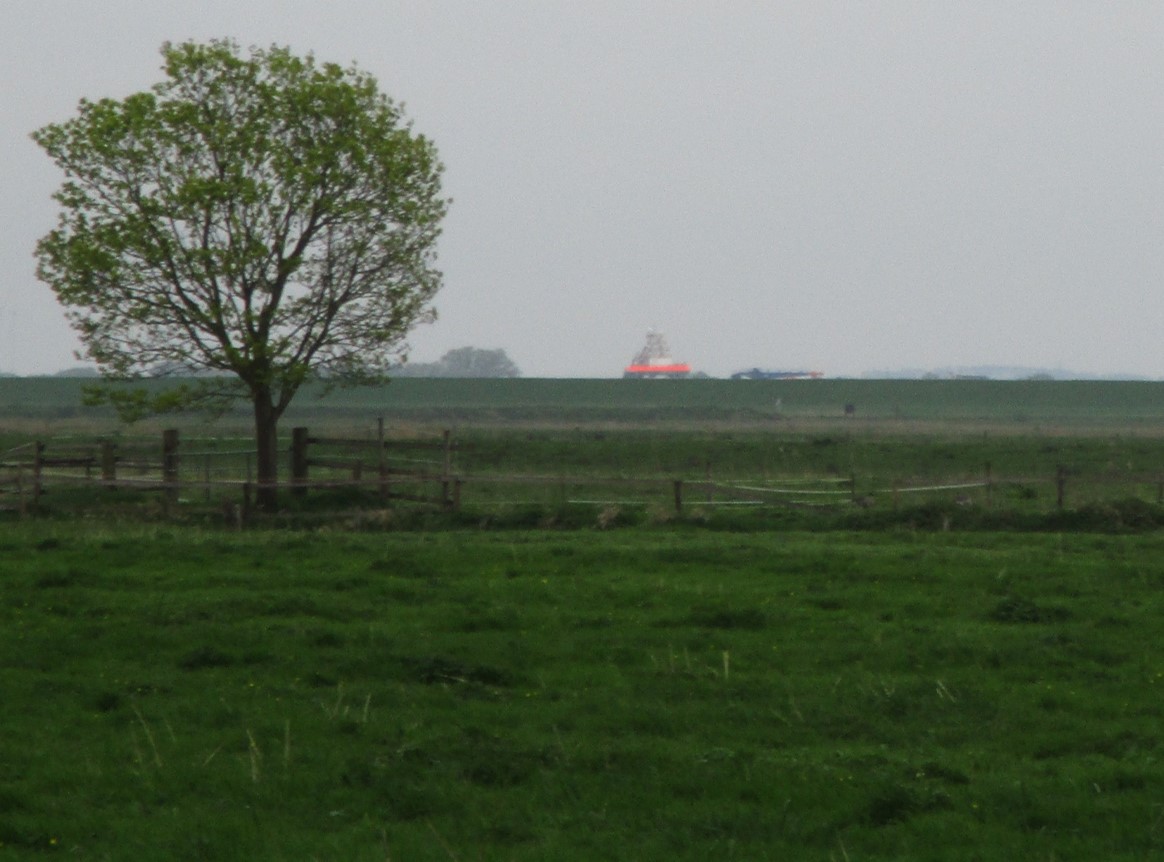 Und jenseits des Elbdeichs … Wanderndes Orange! – Die Vox Ariane zieht, vollbeladen, Richtung Elbmündung, Cuxhaven. Dann muss sie nach Verklappen schnell zurück, um vor der verklappten Ladung wieder am Baggerort einzutreffen. (Circulus viciosus? … nicht witziosus! Das Bruttosozialprodukt verlangt nach mehr.)