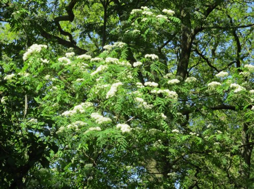 Angang durch Knick- / Waldlandschaft – blühende Vogelbeere vor AltEiche.