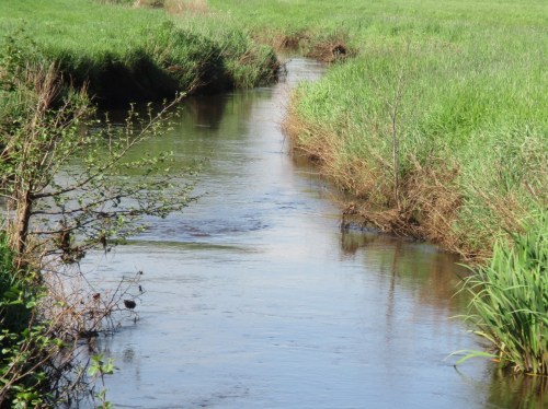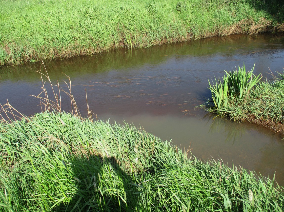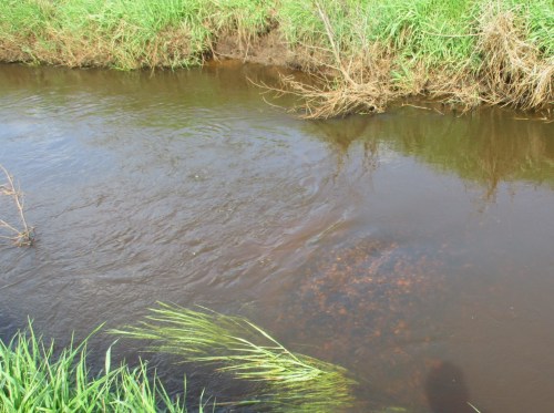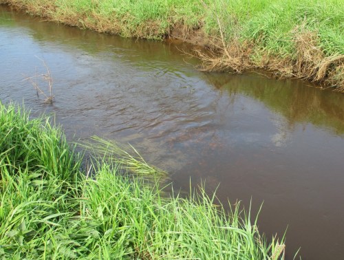 Träge fliesst, eisentrübe, der Kreuzrebenbach in die übersonnte Krückau.