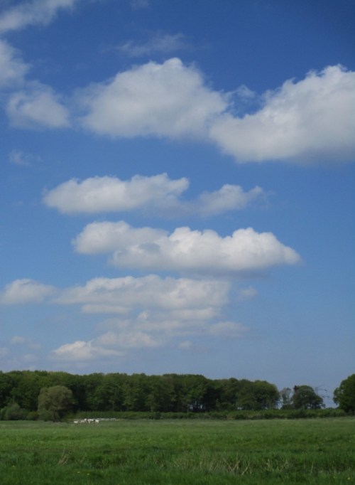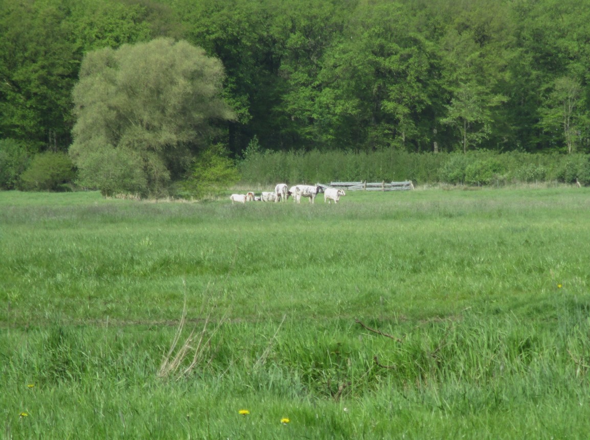 Blick hoch, über die Auenlandschaft – Rinder am Waldrand.