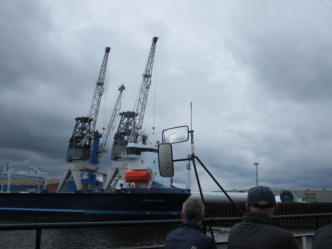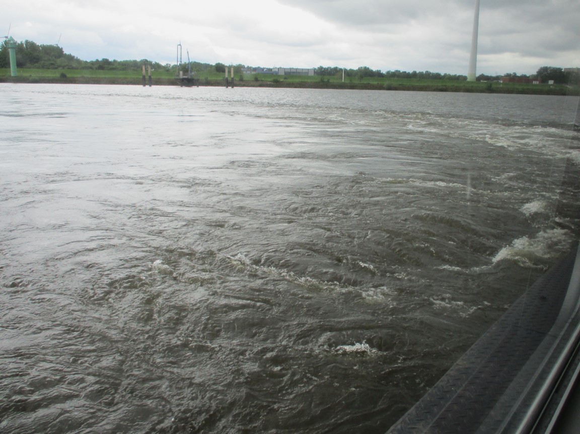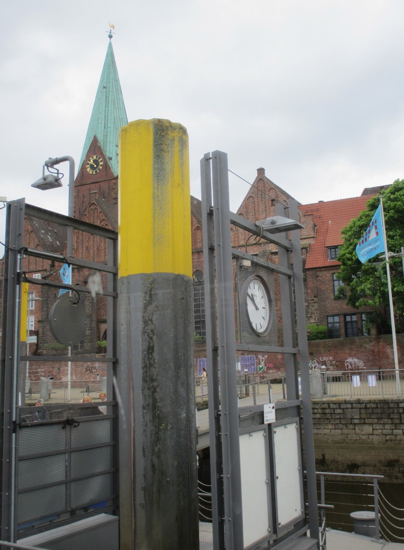 Die Kaimauer zeigt – wir sind mitten dazwischen – die 4-4,5 m Tidenhub (Vergleich HH, Elbe, ca. 3,6 m).