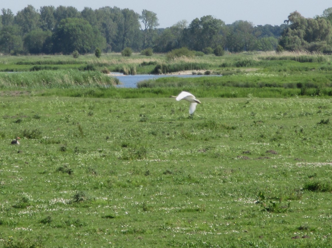 Aus einem Schwanenschwarm auf dem Stillgewässer an der Vogelstation Wedeler Marsch ist einer aufgeflogen. Die äsenden Graugänse interessiert das nicht.