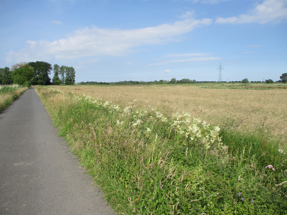 Ringsum wartet hoher Bewuchs auf sommerliche Heuernte, hier Holmer Marsch, vor der Geestkante – am Weg- / Bachrand leuchtet Mädesüß.