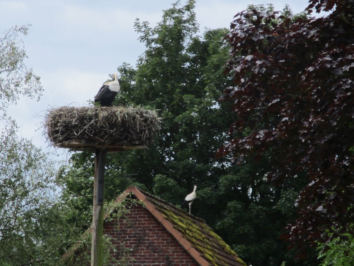 Abholen eines Fachkollegen – die fast erwachsen aussehenden Tangstedter Jungstörche stehen noch auf dem Nest, offenbar beschäftigt mit frischer Futterlieferung.