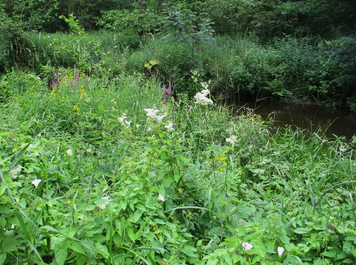 Neuen Landgewinn dankt die Natur per Pflanzensukzession. Am Gewässerrand sind erste Erlen zu erkennen, vorn hat sich flächig eine standorttypische Feuchtgebietsstaudenvegetation angesiedelt – eine blühende Pracht derzeit.