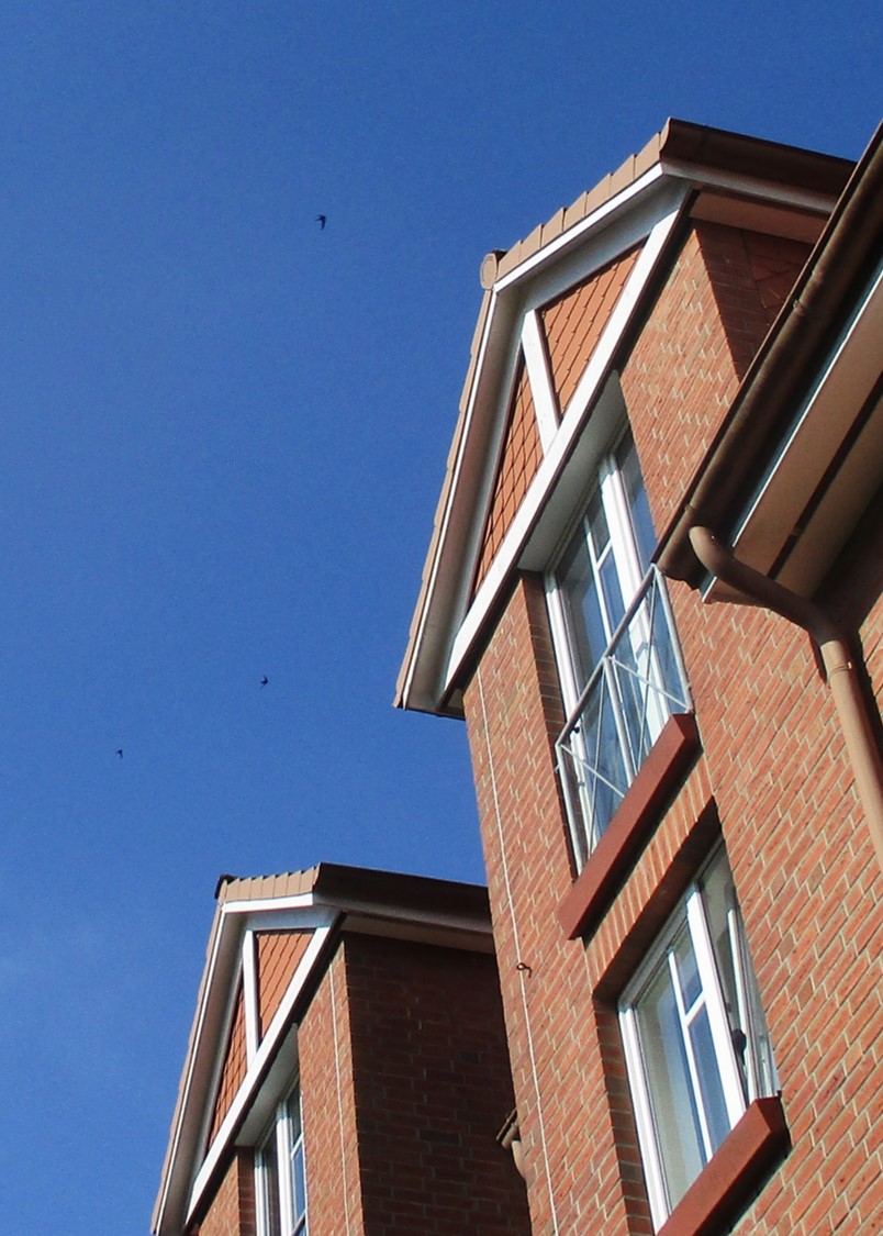 Start, Blick zum Himmel – da sind immerhin erwartete Zweiflügler! Mauerseglers „Junge Wilde“ sehen sich vor Abschied genau um. Mögen sie für nächstes Jahr unsere Kästen als die mit dem Vornamen „Mauersegler…“ erkennen.