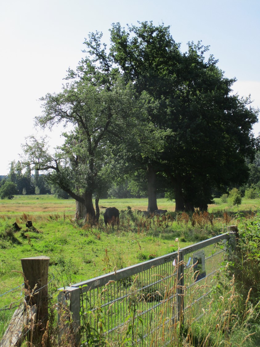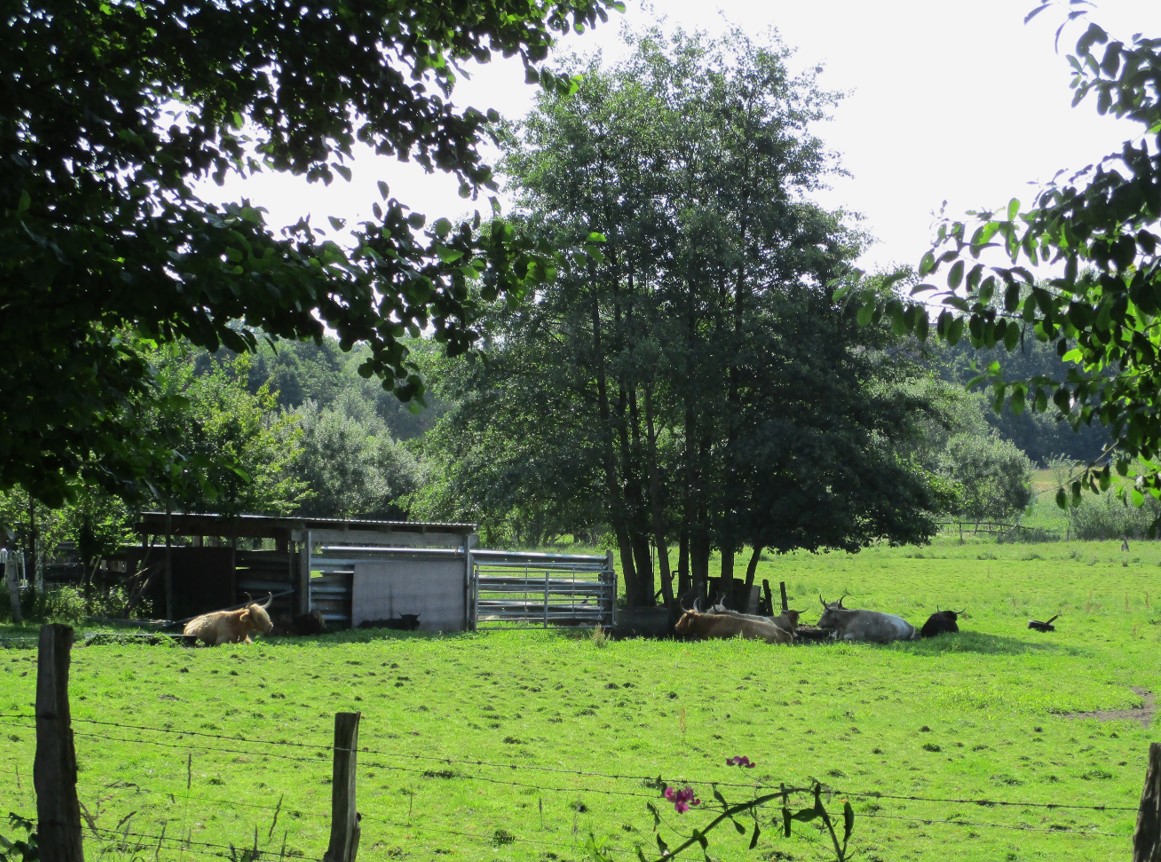 Das vordere Highland-Rind zeigt allerdings auch, dass bei ungünstiger Schattenspenderwahl hochsteigende Sonne das Vorhaben frühzeitig beendet. Als Wiederkäuer, beschäftigt, bleibt man dann doch eher liegen.