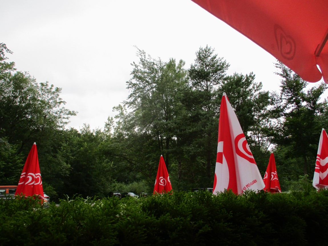 … hin zum Aussensitzplatz, gleich neben dem Wildgehege Klövensteen. Der Himmel ist zugezogen, ich wähle einen Platz unter großem Schirm.