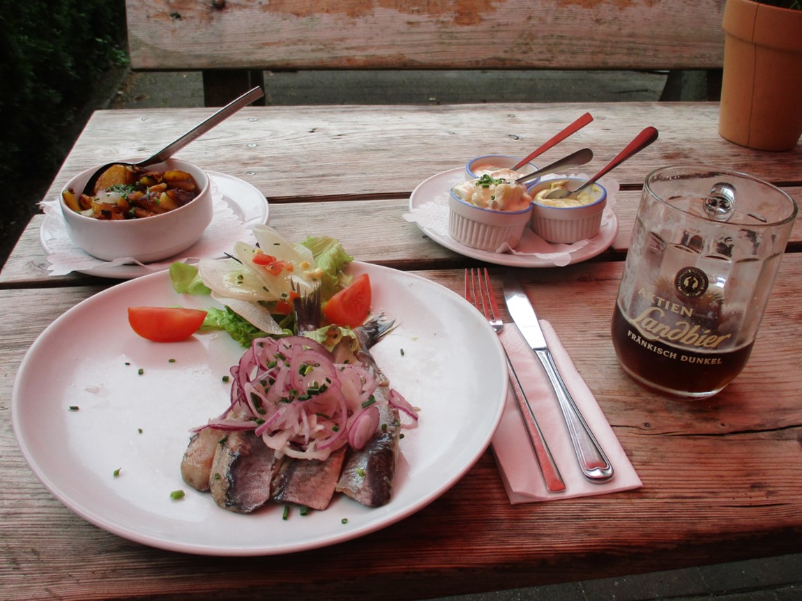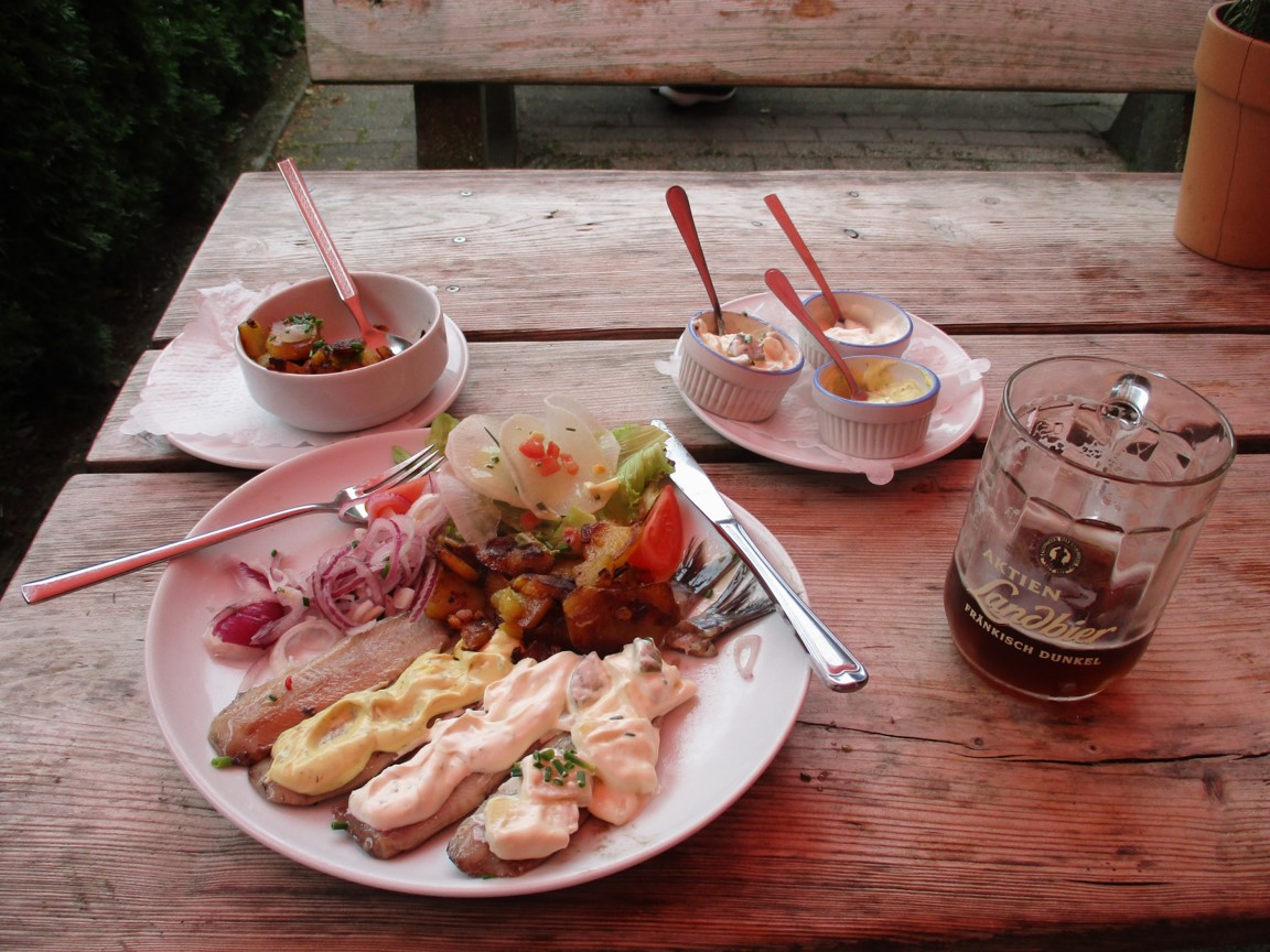 Da sind zu nennen: Apfel-Zwiebel-Gurken-Sahnesauce, Creme-Fresh-Dillsauce sowie Senf-Honig-Dillsauce – nicht zu vergessen, die empfehlenswerten Bratkartoffeln! – Man gönnt sich ja sonst nichts.