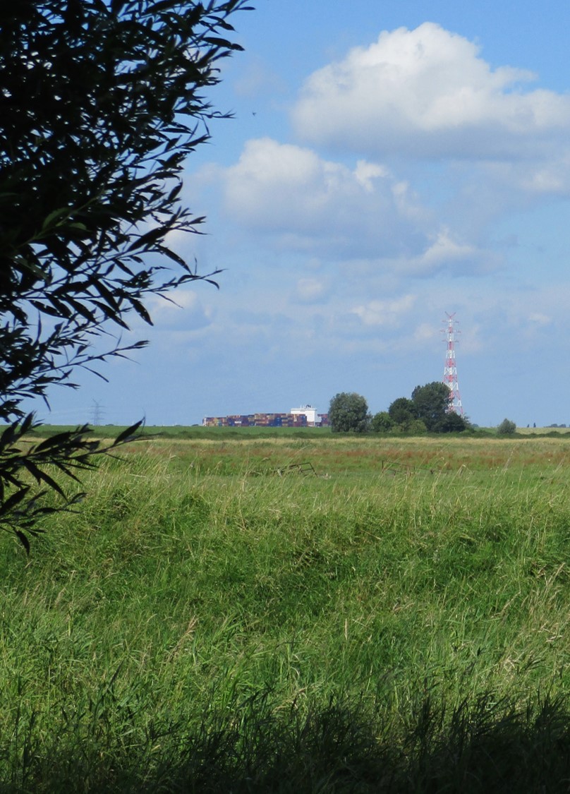 Langer Damm, Weitblick – jenseits des Deichs fährt etwas Richtung HHHafen. Der Containerfrachter APL Vancouver 328 x 45 m, Tiefgang 14 m.