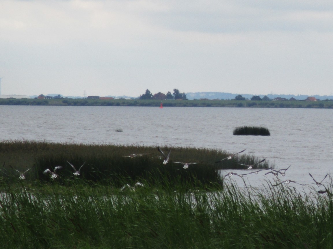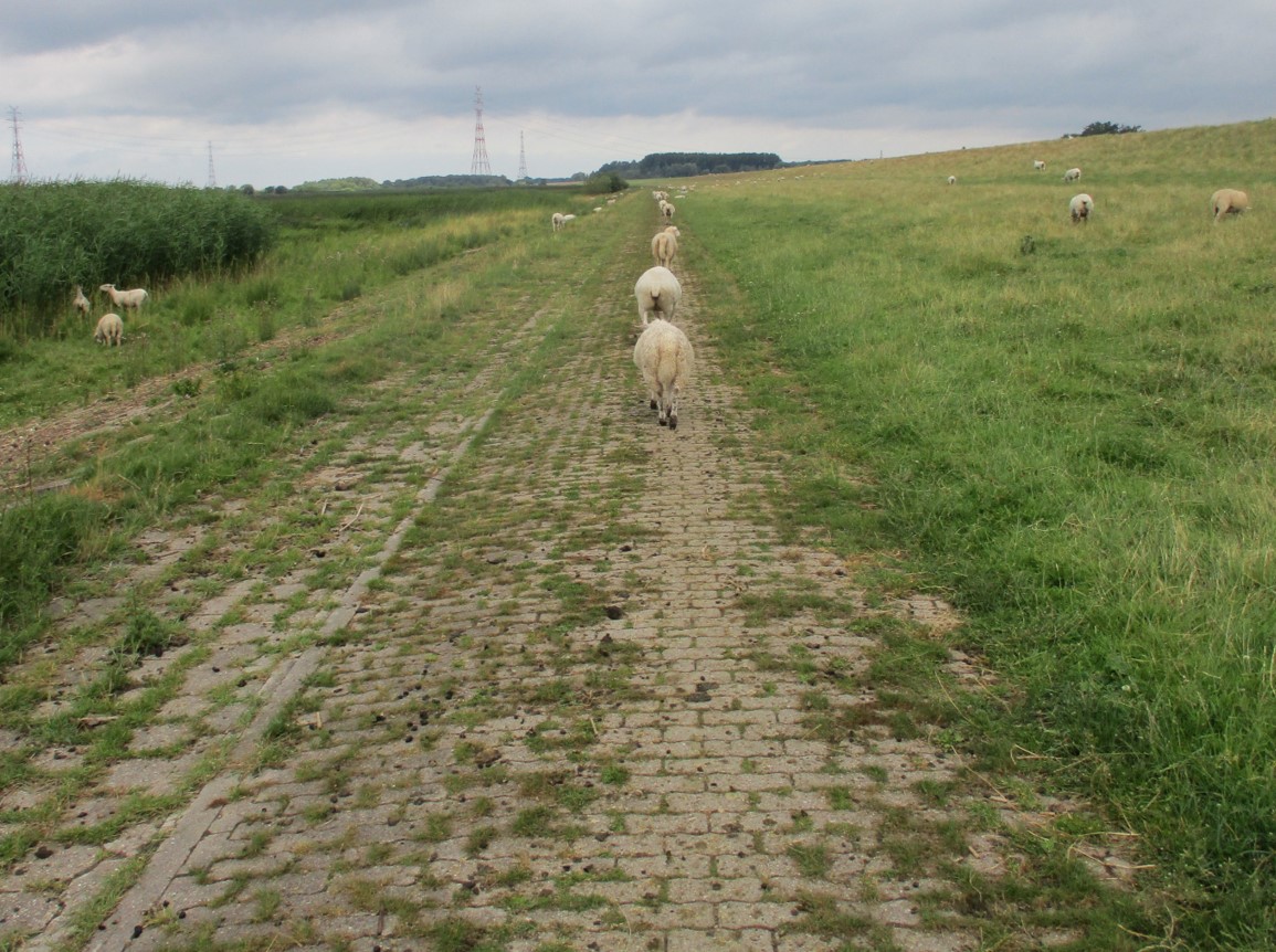 Nebendran wundern sich Schafe über den – an diesem Tag – einsamen Radler. Gänse halten sich Raubzeug-geschützt auf dem überschwemmten Süßwasserwatt auf.
