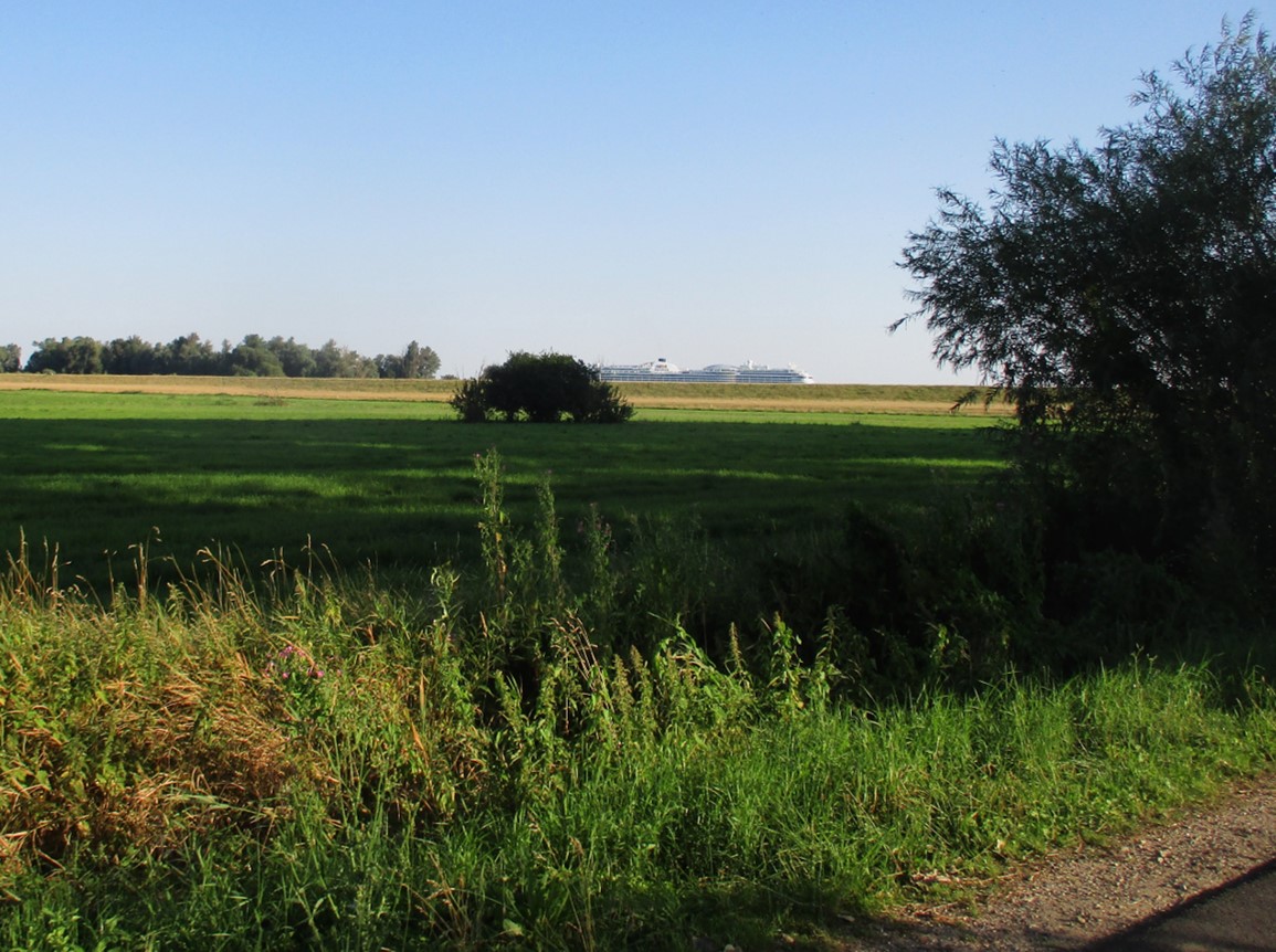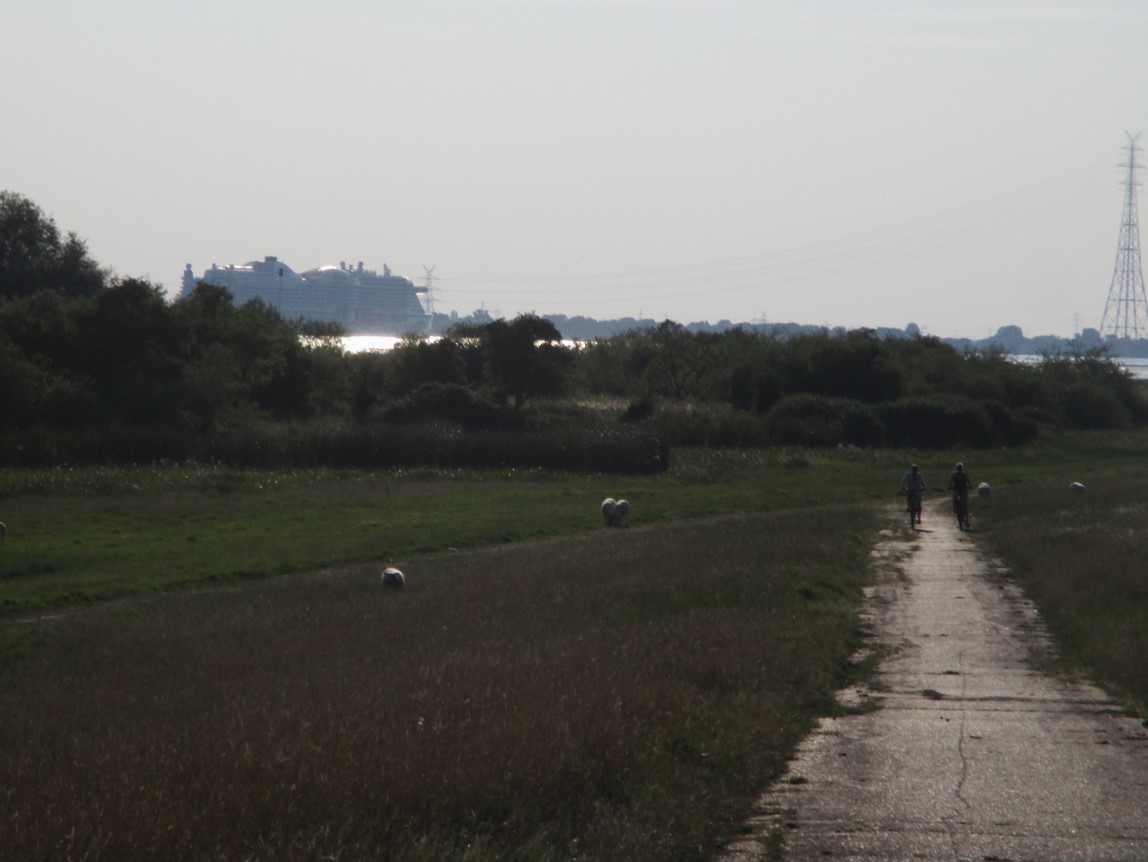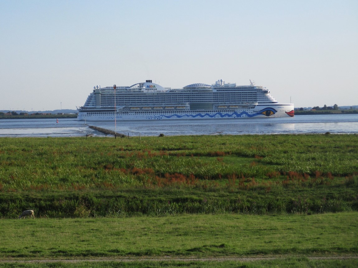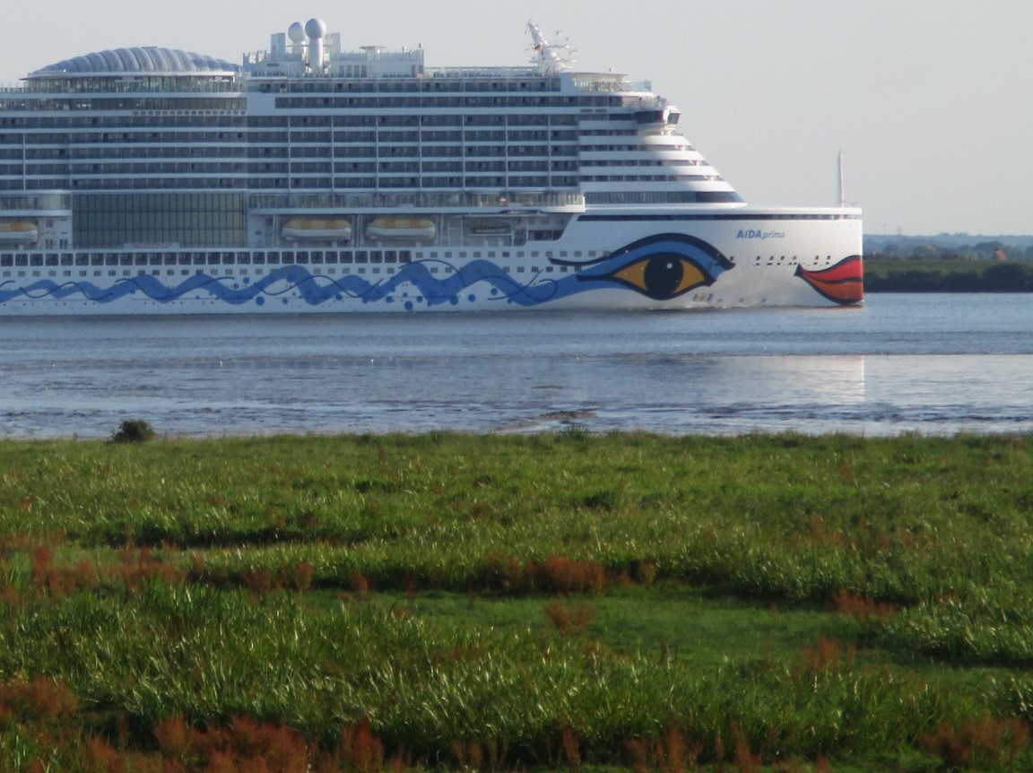Elbdeich Fährmannssand, Deichkrone – Tnw auf der Elbe, Süßwasserwatt liegt frei. Der Scheinriese stellt sich als Aida Prima heraus, immerhin.