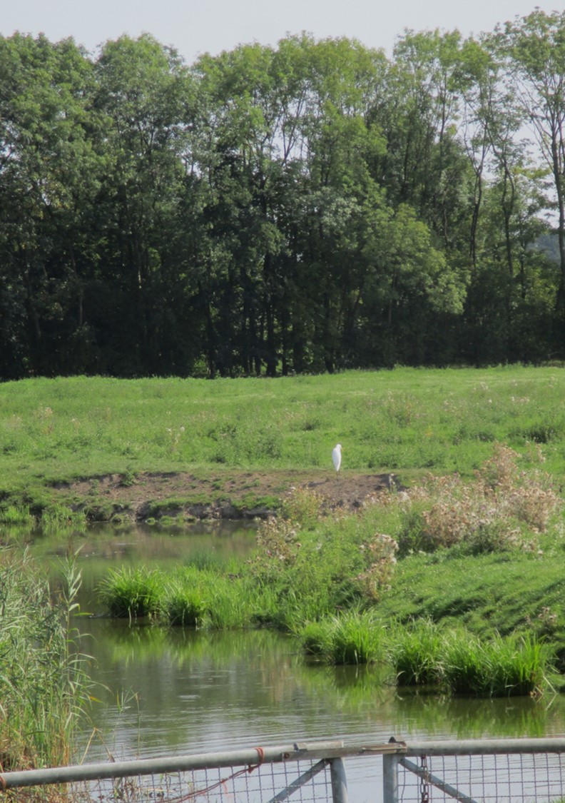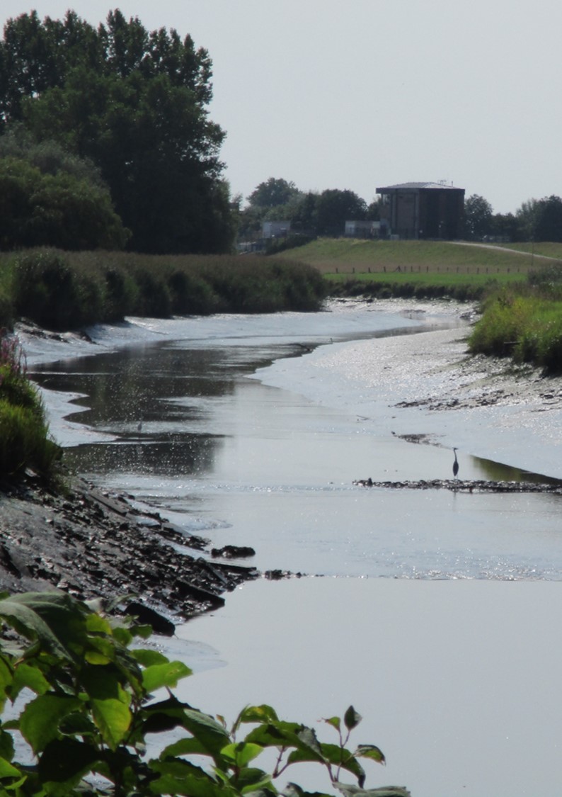 Ein Graureiher beobachtet das abfliessende Wasser der Binnenelbe genau, weiss, warum er hier steht – Hintergrund: Elbdeich mit Sperrwerk Wedeler Au.