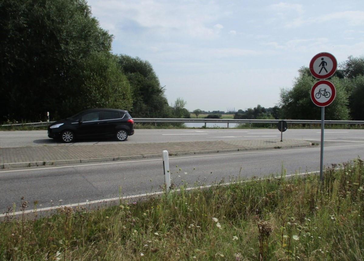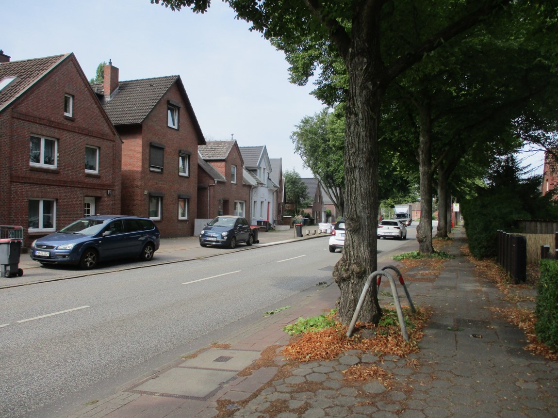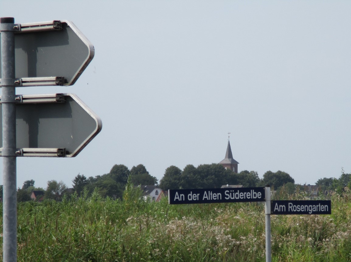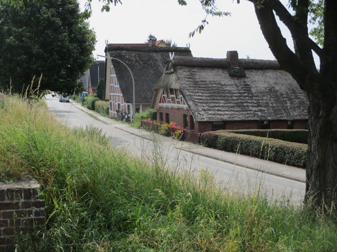 Entlang der Hauptstraße Finkenwerder – man glaubt`s nicht: Dies ist noch immer eine der Haupt-rush hour-Routen im südlichen Hamburg. – Zur Zeit, wie zu sehen, rusht es gerade nicht.