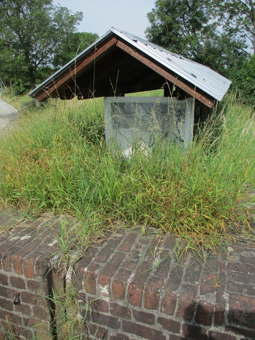Das muss die Hitze sein! – – – Vorn im Bild sichtbar ist die Erklärung. Einschubhalterungen für Sturmflutschutz. „Schotten“, das sind hier unter Dach auf der Deichkrone gelagerte haltbare Bretter, die die Einstauhöhe der Sturmflut-Elbe bei Bedarf aufstocken (möge das Vergangenheit sein, der Hauptdeich im Norden immer halten).