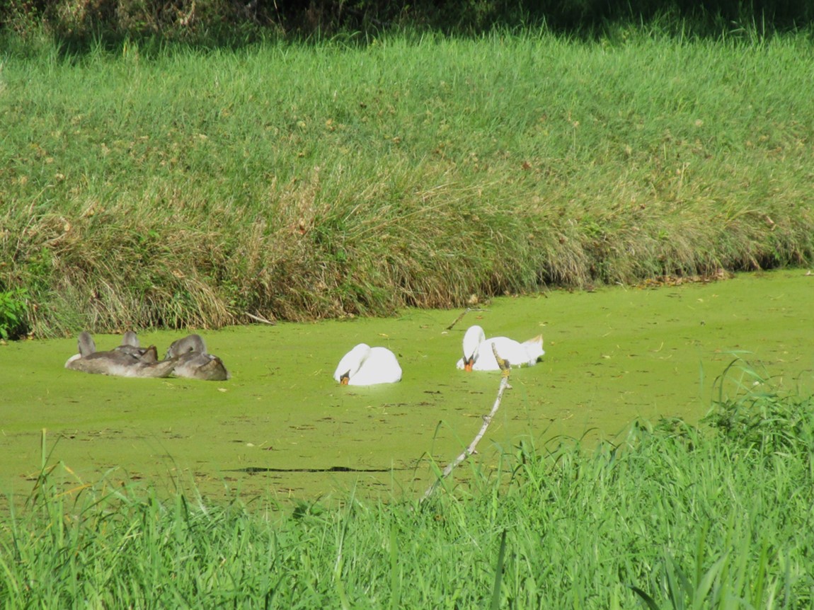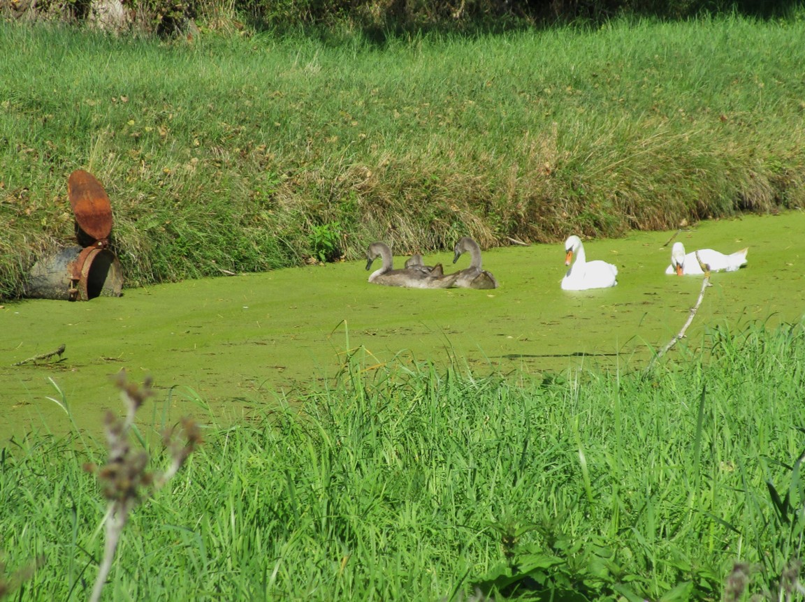 Familie Schwan, 3 Jungvögel, greift offenbar aus dem Vollen – die Oberflächenschicht aus Wasserlinsen wird intensiv abgegriffen, das schnabuliert und schmatzt …