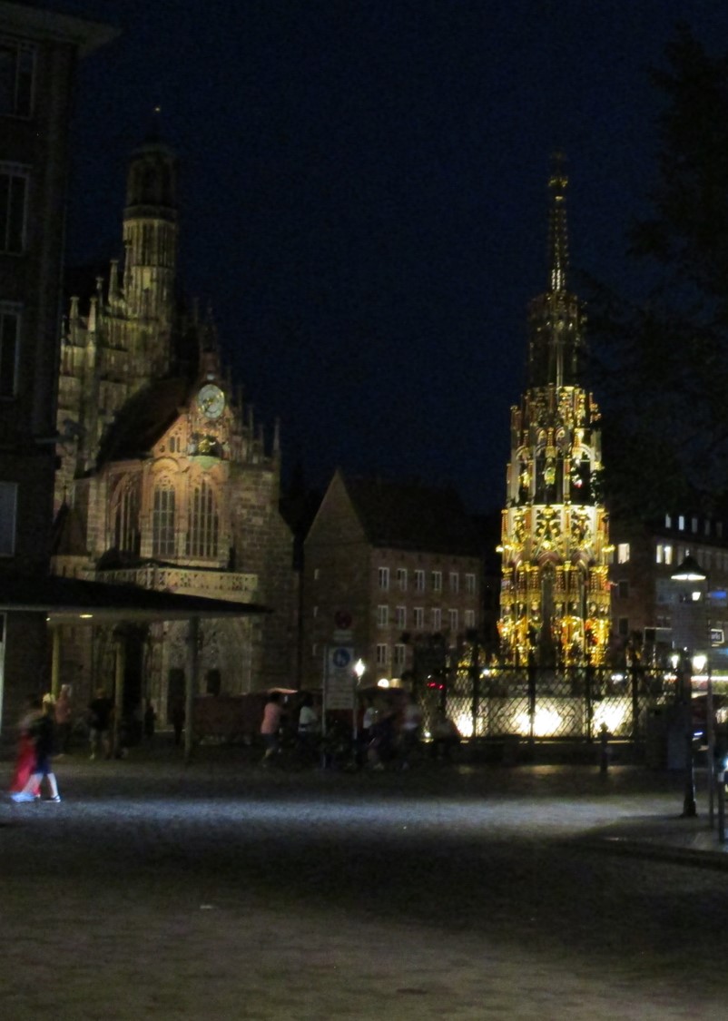 Nürnberg, Abendlicht auf „Schöner Brunnen„, dahinter die Frauenkirche.