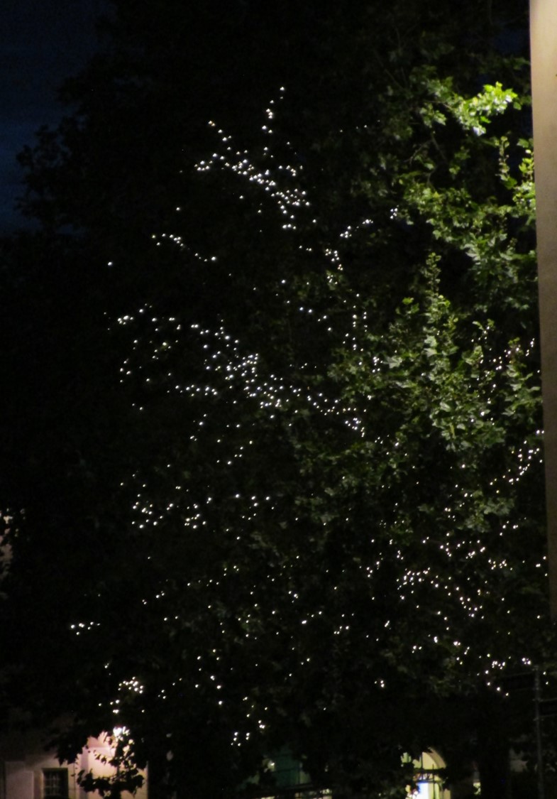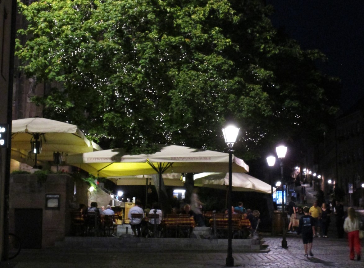 … tut nicht nur dem Schäufele, sondern auch den beiden Geniessern gut – Biergarten mit Lichtern im Baum.