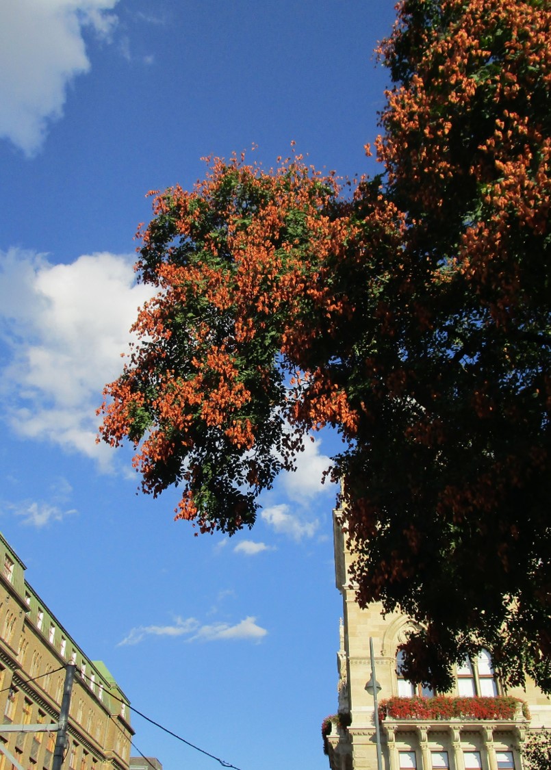 Rathaus, Blick auf die Nordwestecke – die Fahne steht stramm im Wind. Den Baum mit den auffälligen Samenständen …