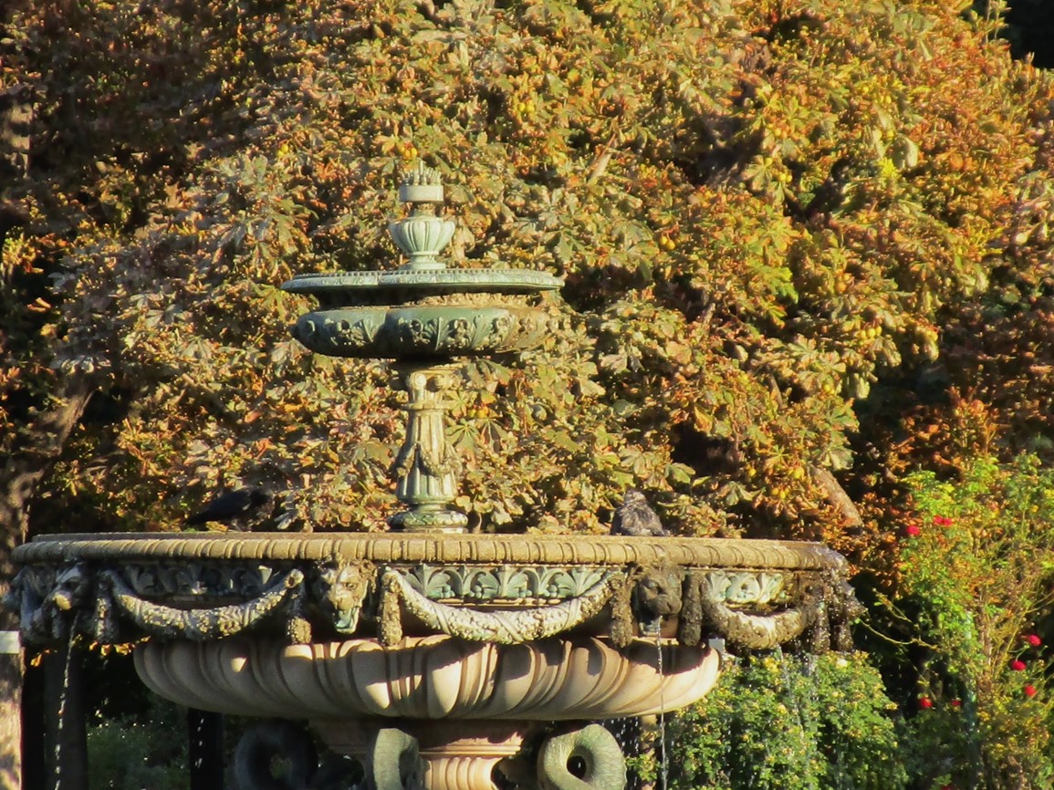 Hitze! – Kaum erkennbar geniessen eine Raben- und eine Nebelkrähe das Nass des Volksgartenbrunnens. – Alle Kastanien ringsum sind heftig Krankheit- bzw. Parasiten-befallen.