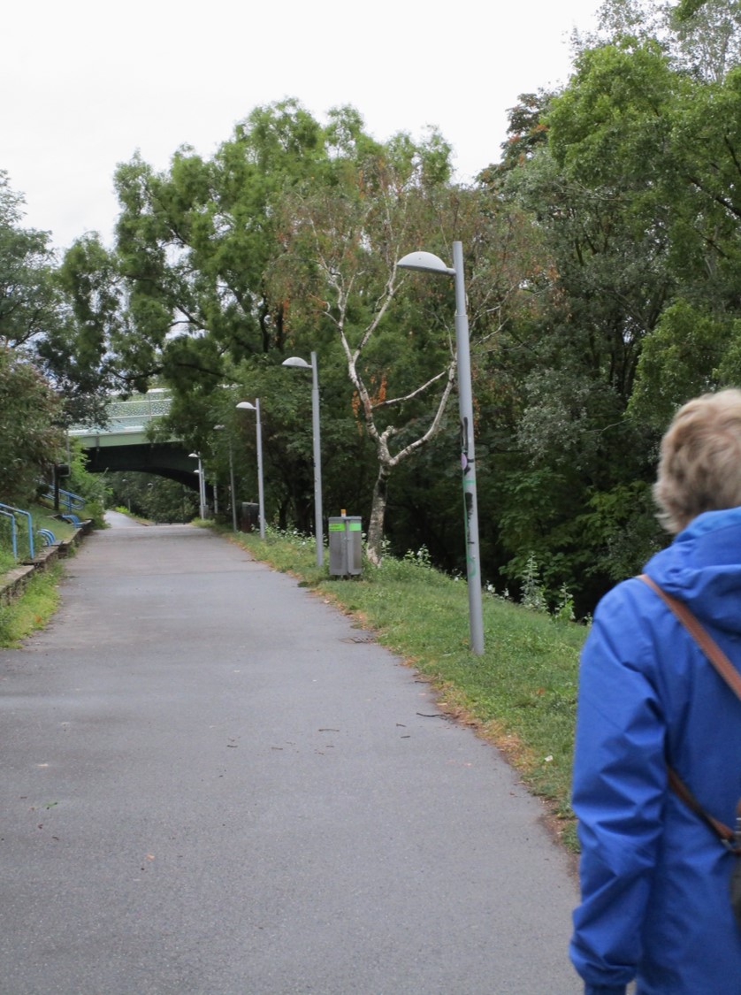 P+R – wir stehen unter Spittelaubrücke und -steg, wollen für die Rückwanderung auf die andere Seite. Dort scheint neben dem Radweg auch ein wenig parkartiges Grün vorhanden.