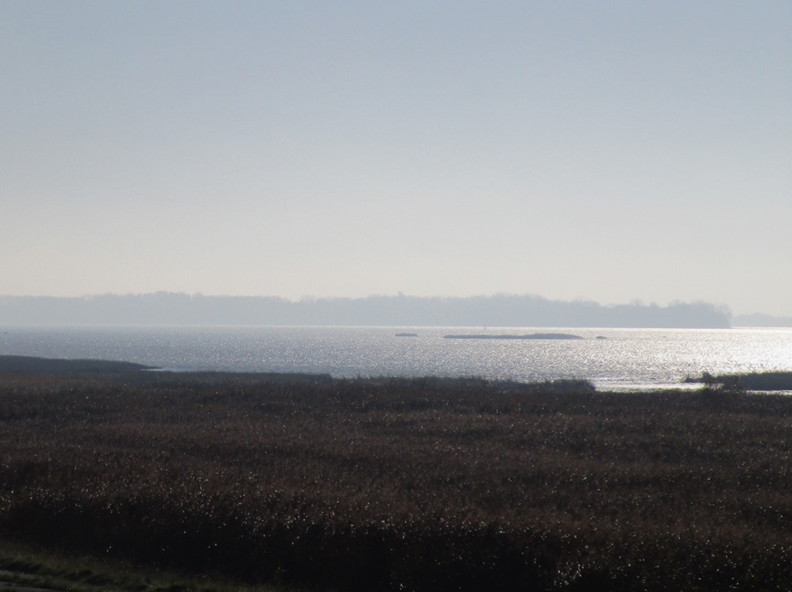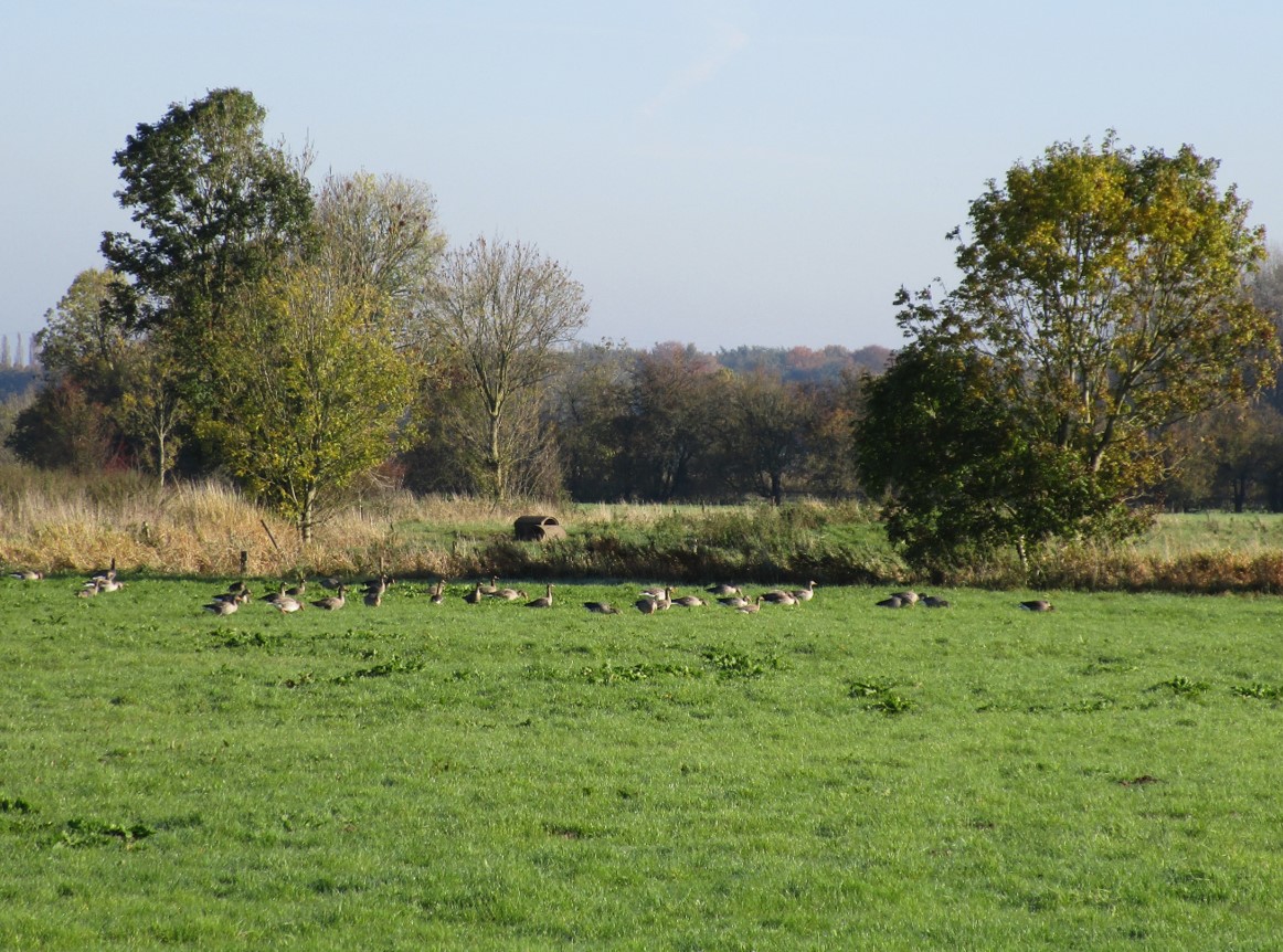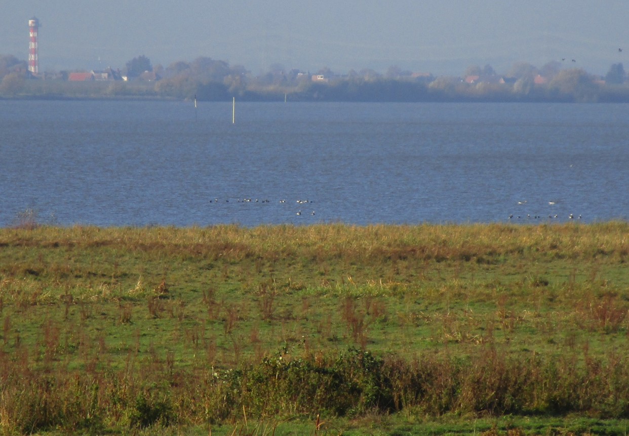 Etwas östlich gibt sich die Marsch kühler, leicht diesig – auf den Wiesen weitere Nonnengänse.