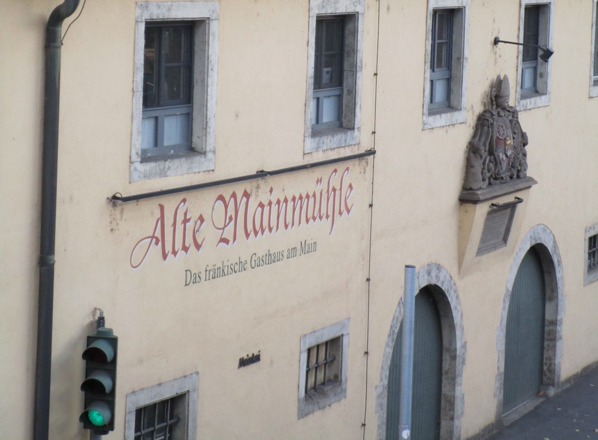 Die Alte Mainmühle, schräg im Angang von der Alten Mainbrücke aus angesehen.