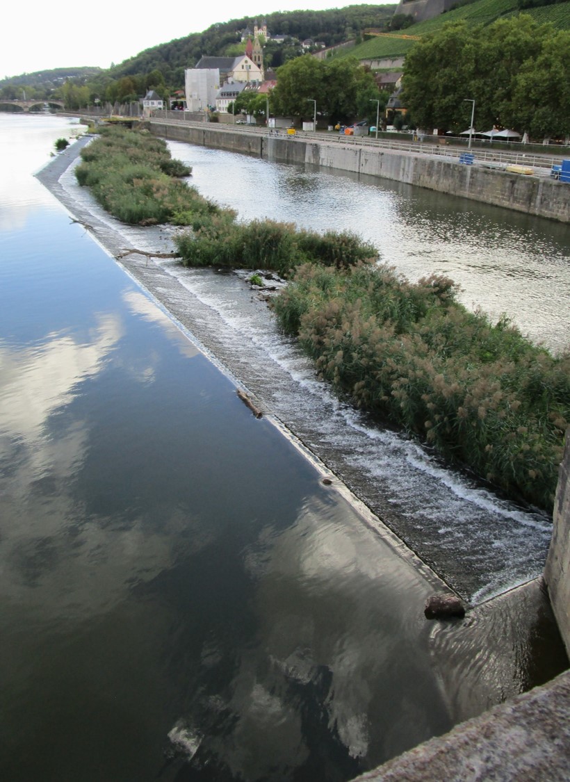 Parallel zum Mainverlauf – Blick flussauf – das Gleitwehr, lässt seitwärts bei höheren Abflüssen große Wassermengen ins Tiefere schiessen und abfliessen.