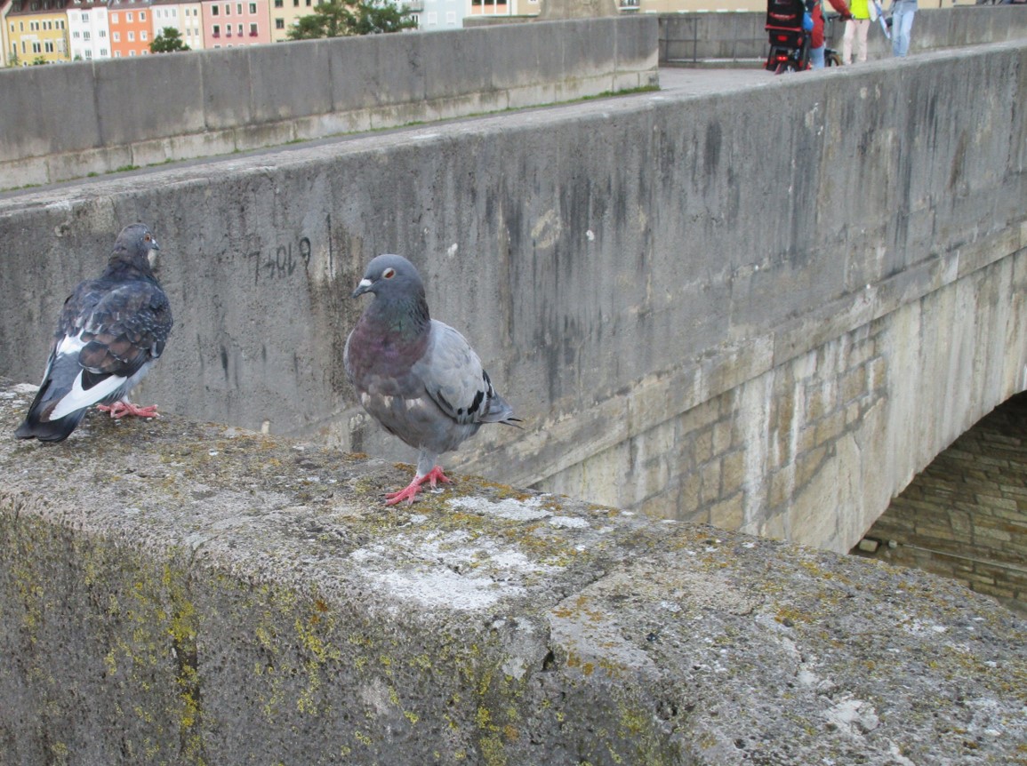 Zwei Stadttauben auf der Mainbrücke – die warten nicht zwingend auf Fütterung, haben mit sich zu tun.