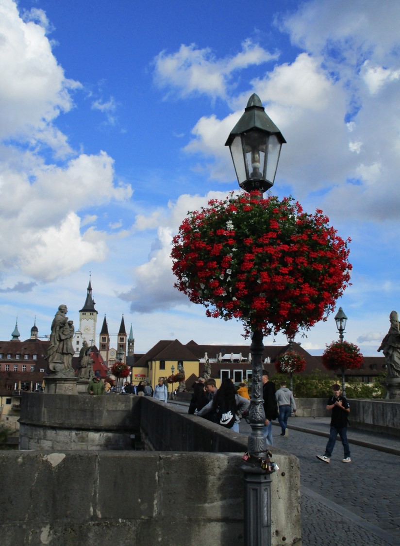 Die Alte Mainbrücke, Blick Richtung Altstadt – Blumen, Heilige, jede Menge Passanten, Besucher, Altstadt-Silhouette.
